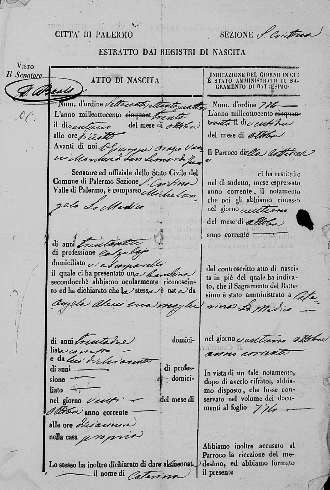 Caterina Lomedico was born on October 20, 1830 in Santa Cristina, Palermo, Sicilia, Italy. She and