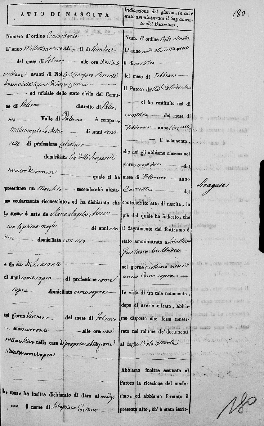 Sebastiano Gaetano Lomedico was born on February 21, 1820 in Santa Cristina, Palermo, Sicilia, Italy. He died on February 27, 1820, at age 0, in Santa Cristina, Palermo, Sicilia, Italy.