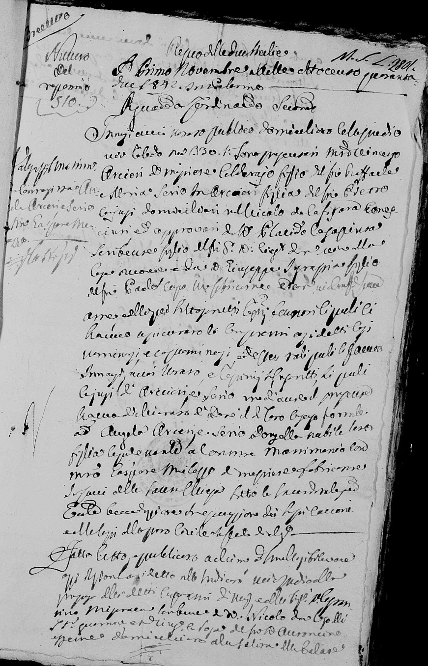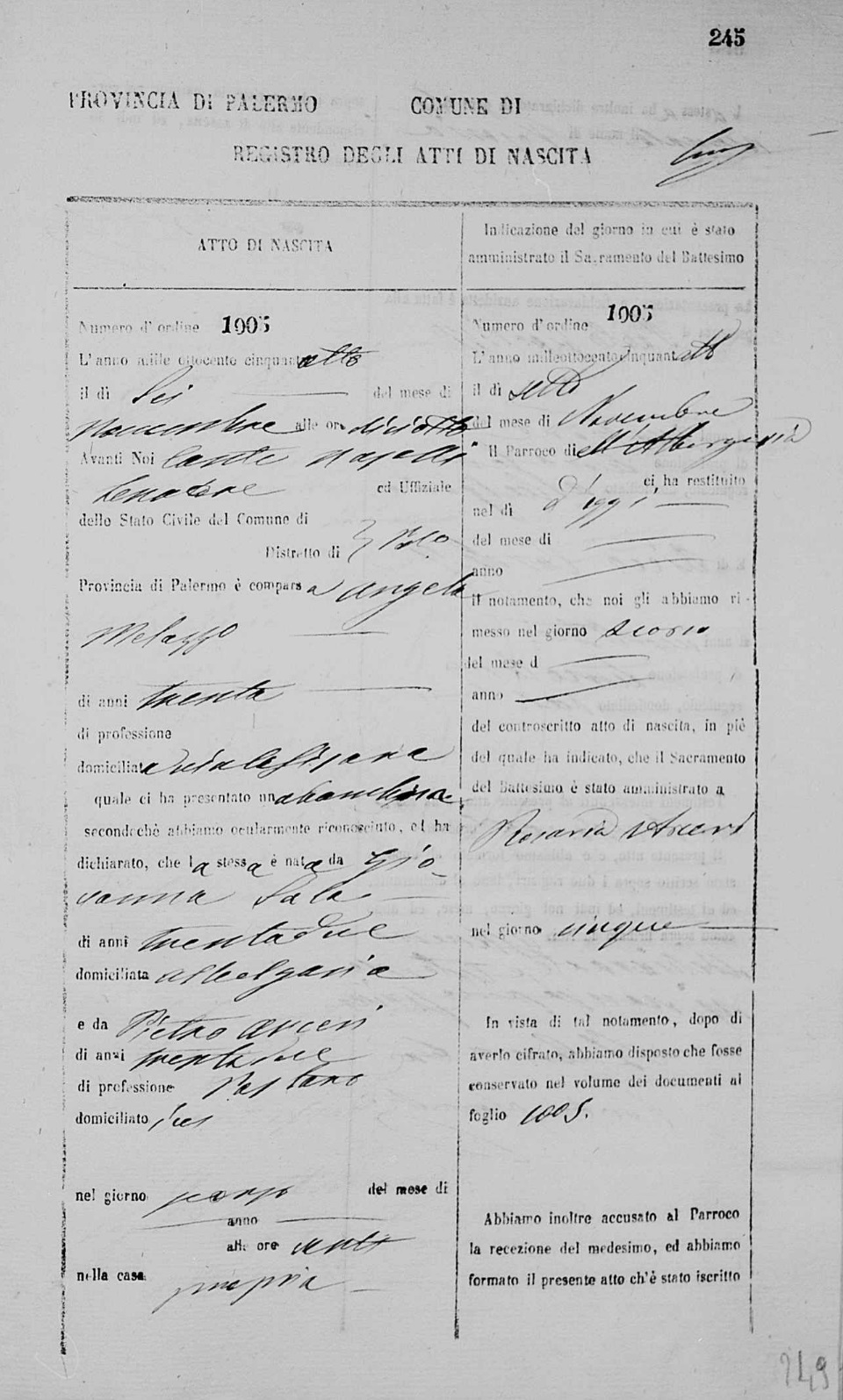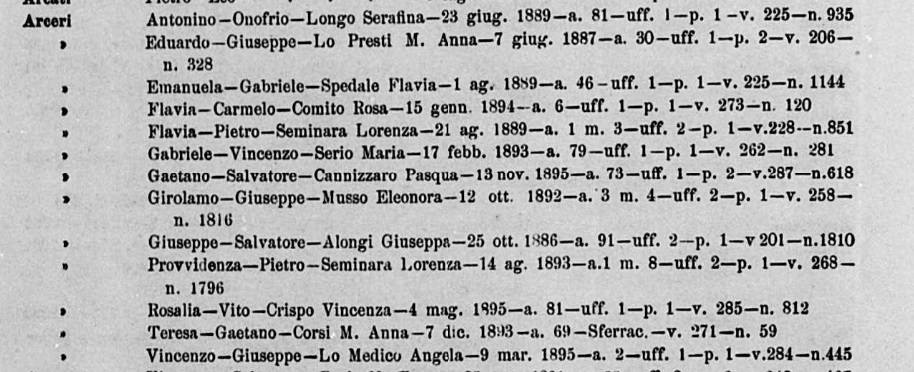 Angela Arceri were married on November 12, 1842 in Santa Cristina, Palermo, Sicilia, Italy. He died on January 1, 1895, at age 83, in Palermo, Sicilia, Italy.