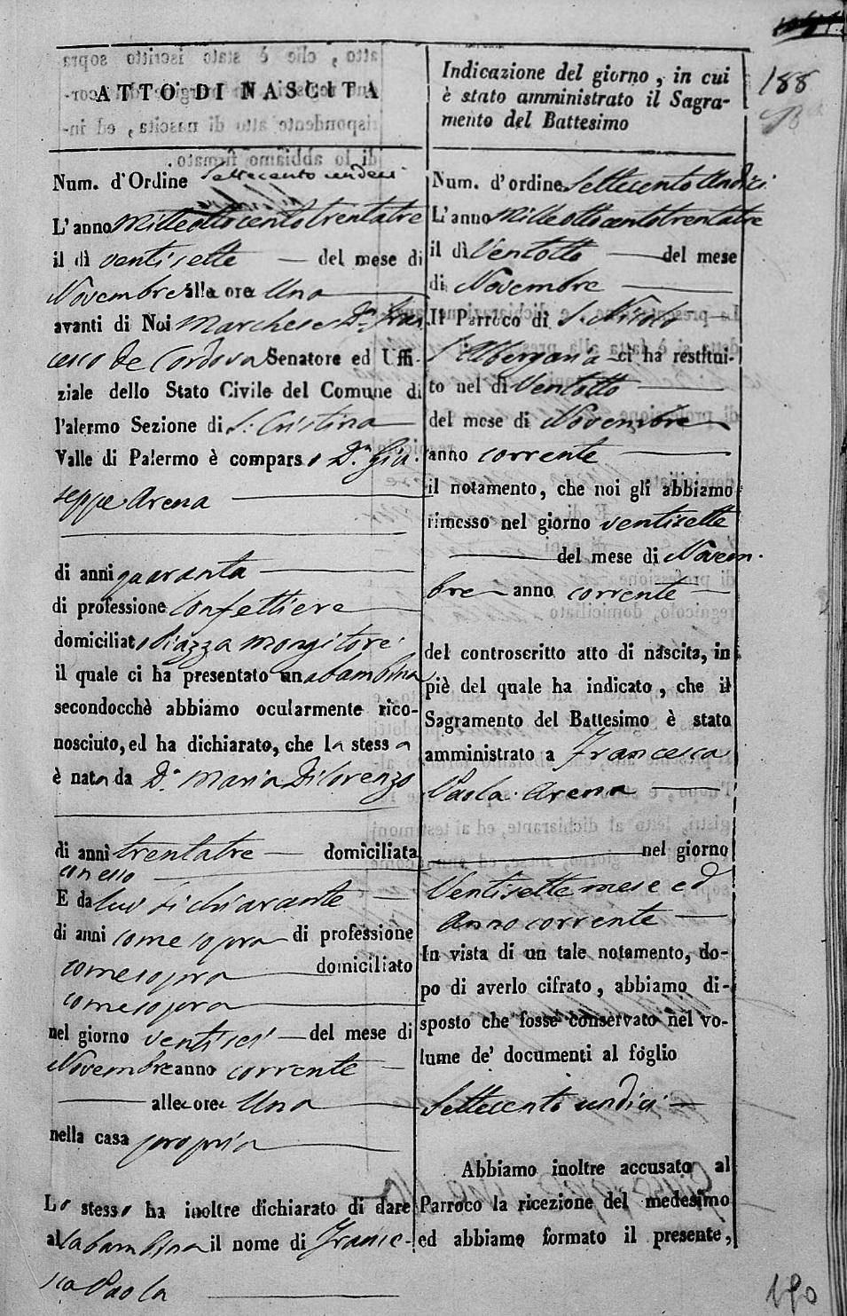 Nunzio Arena was born on April 22, 1841 in Santa Cristina, Palermo, Sicilia, Italy. He died on April 15, 1863, at age 21, in Zisa, Palermo, Sicilia, Italy.