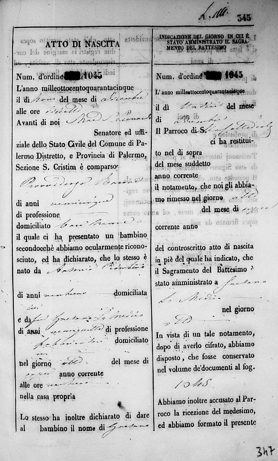 1845 Birth Record Page 1