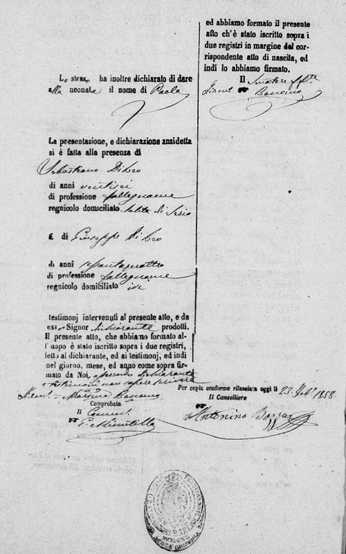 Salvadore Tipa were married on January 18, 1838 in Santa Cristina, Palermo, Sicilia, Italy. She died.