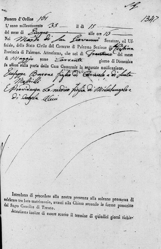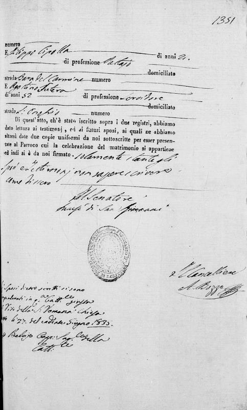 Providenza Lomedico were married on June 27, 1835 in Santa Cristina, Palermo, Sicilia, Italy. He died on December 26, 1883, at age 76, in Palermo, Sicilia, Italy.
