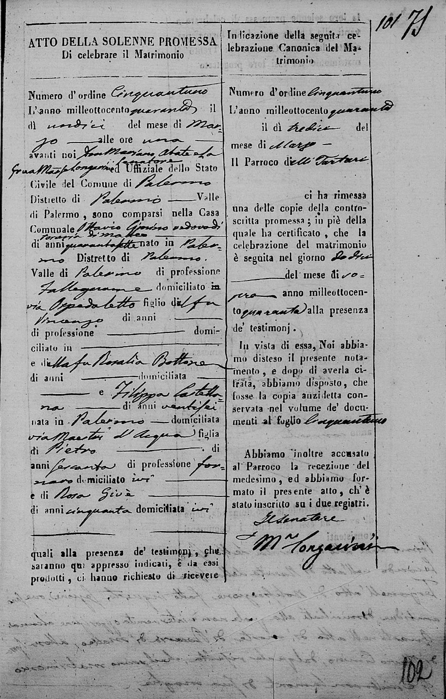 Filippa Castellana were married on March 13, 1840 in Sant'Agata, Palermo, Sicilia, Italy. He died on March 16, 1874, at age ~81, in Palermo, Sicilia, Italy.