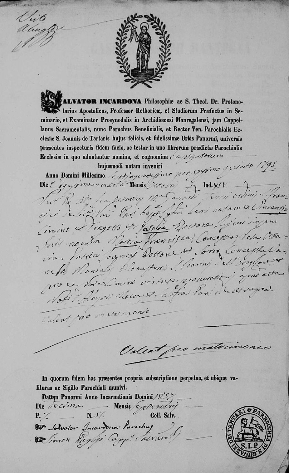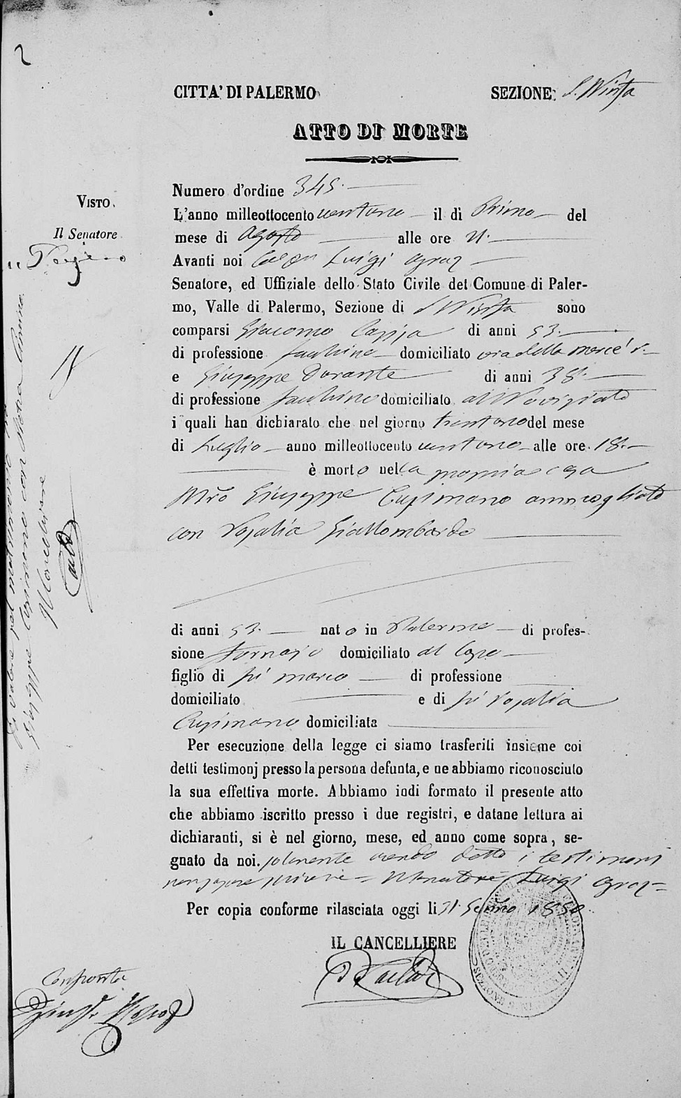 Maria Concetta Cimino were married. He died on November 21, 1854, at age ~72, in Sant'Agata, Palermo, Sicilia, Italy.