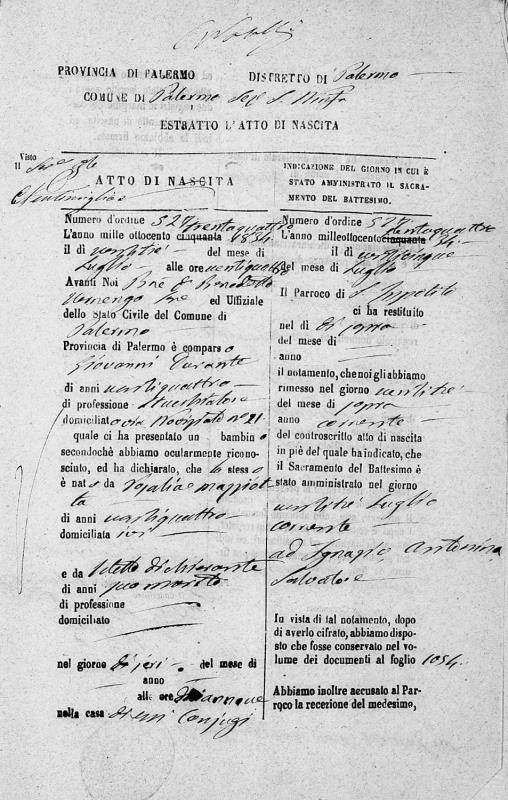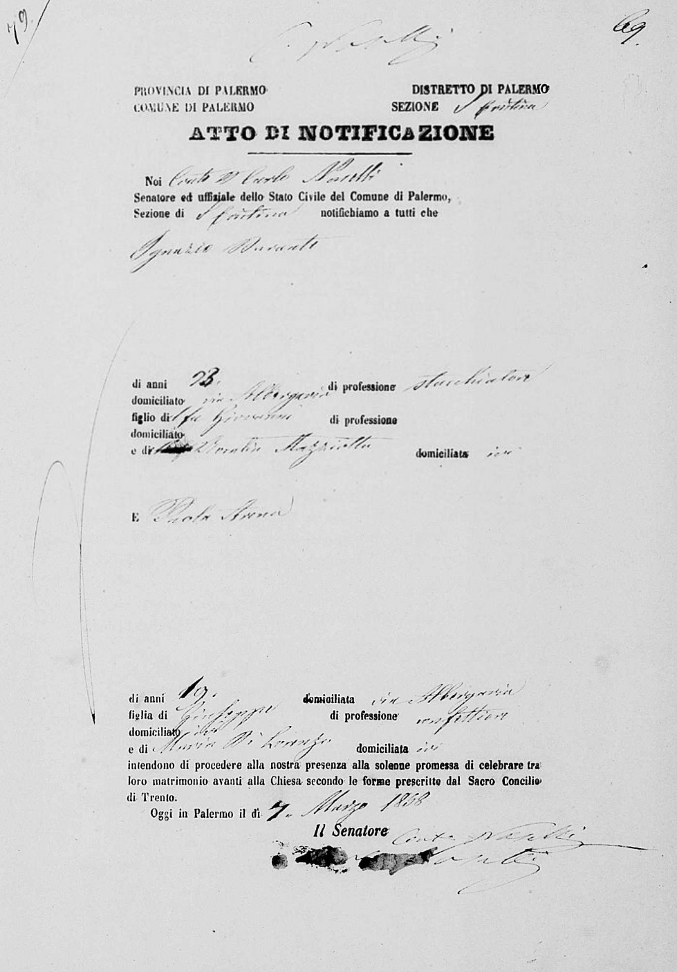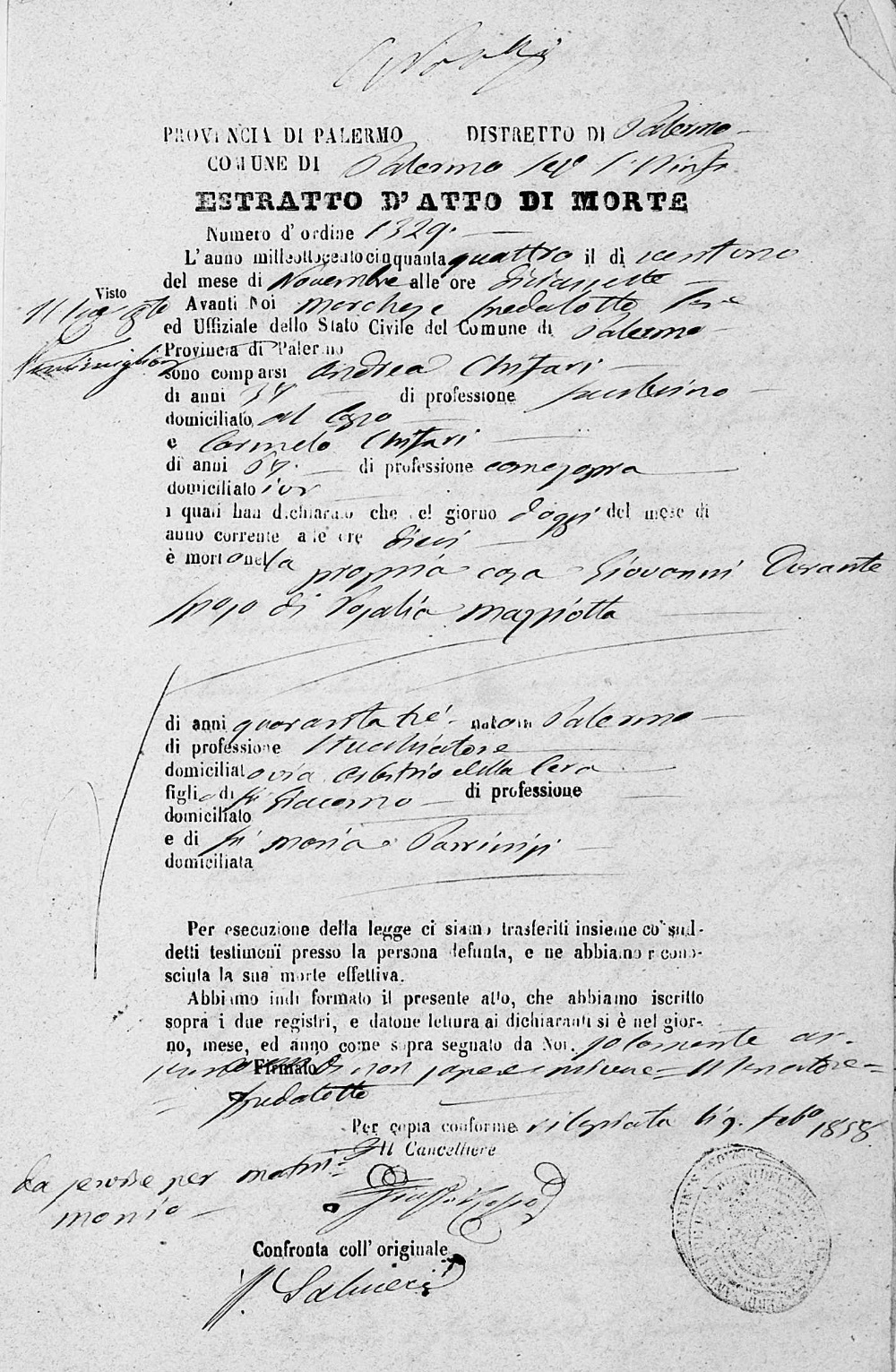 Paola Arena were married on March 27, 1858 in Santa Cristina, Palermo, Sicilia, Italy. He died.