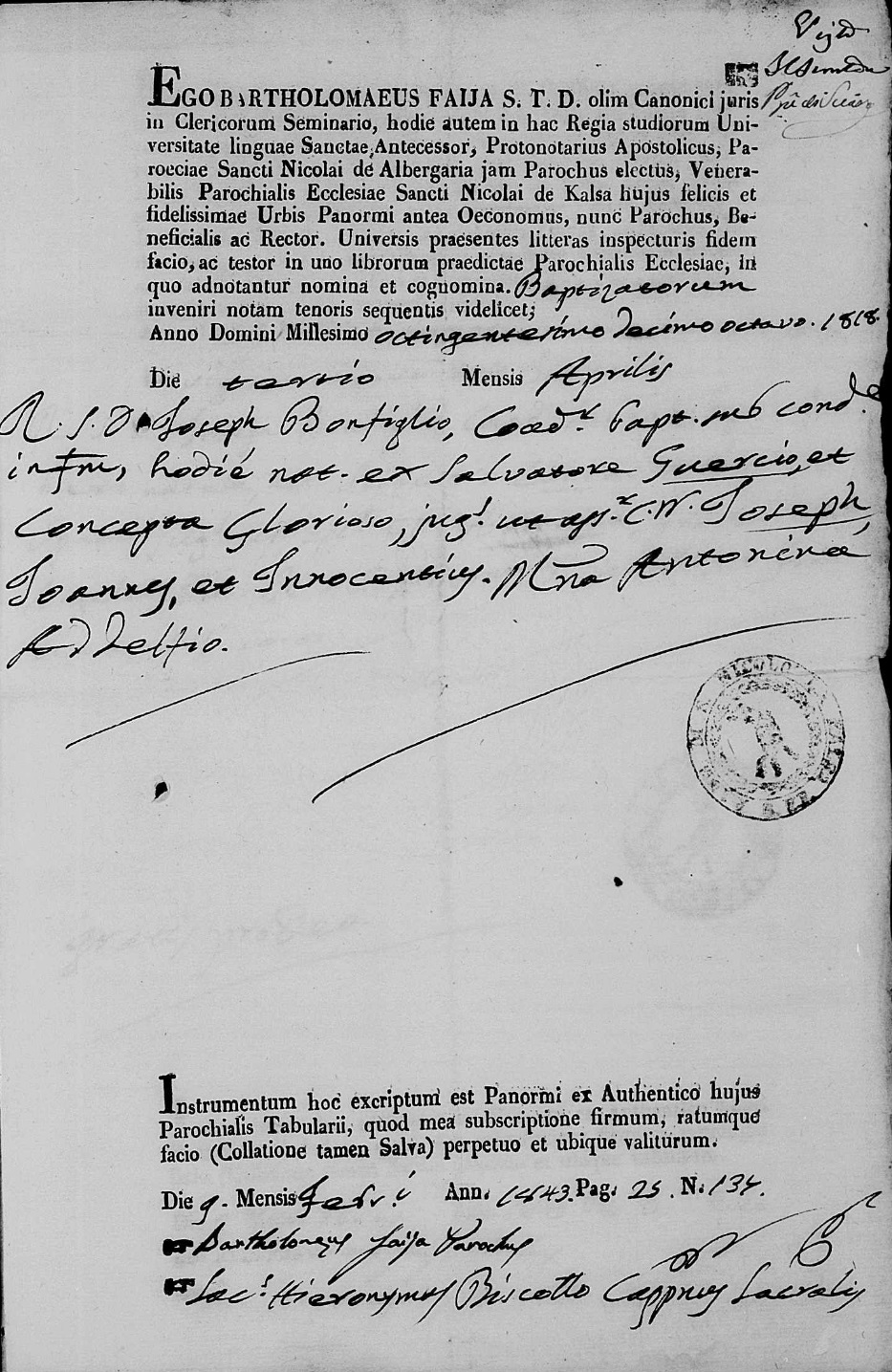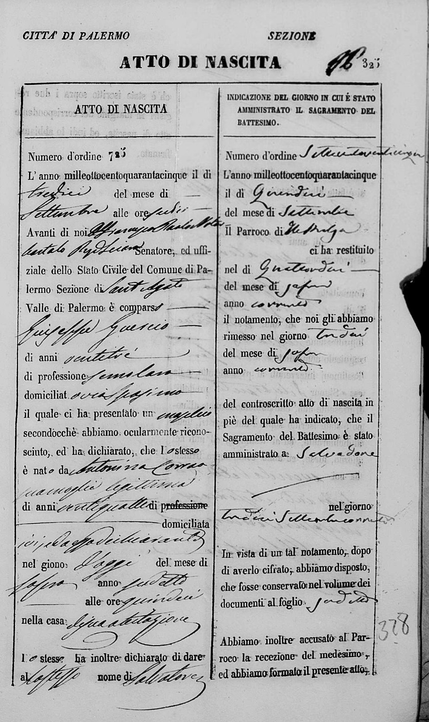 Antonina Corrao were married on October 16, 1843 in Sant'Agata, Palermo, Sicilia, Italy. He died on July 2, 1876, at age 58, in Zisa, Palermo, Sicilia, Italy.