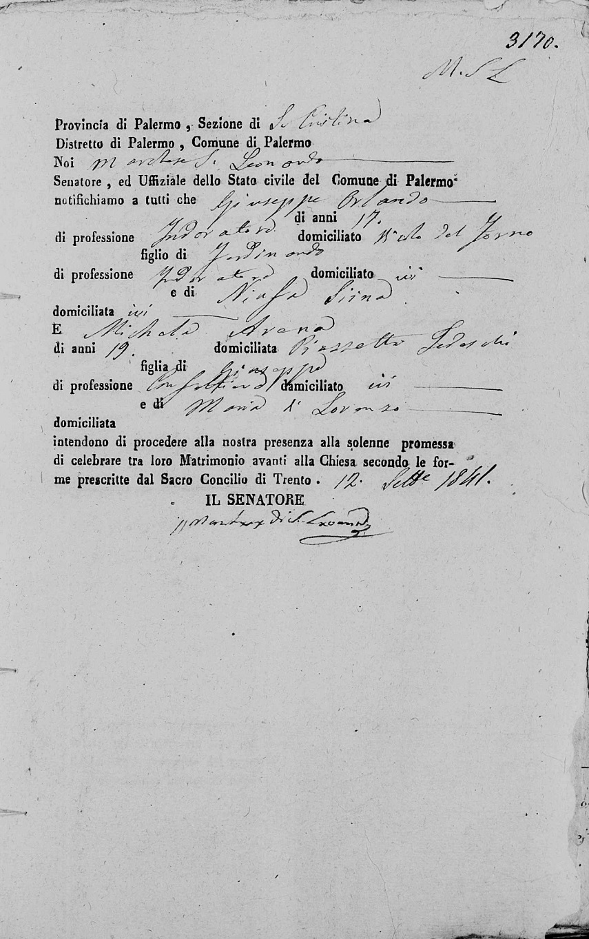 Giuseppe Orlando was born on March 18, 1824 in Santa Cristina, Palermo, Sicilia, Italy. He and