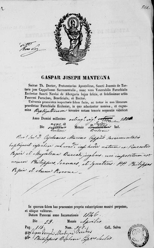 Filippo Papia was born on July 9, 1820 in Santa Cristina, Palermo, Sicilia, Italy. He and
