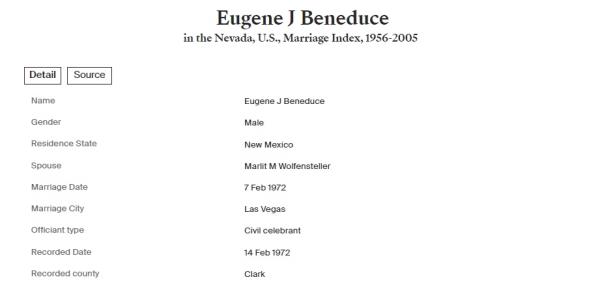 Eugene Joseph Beneduce were married on February 7, 1972 in Las Vegas, Clark, Nevada, USA. She died.