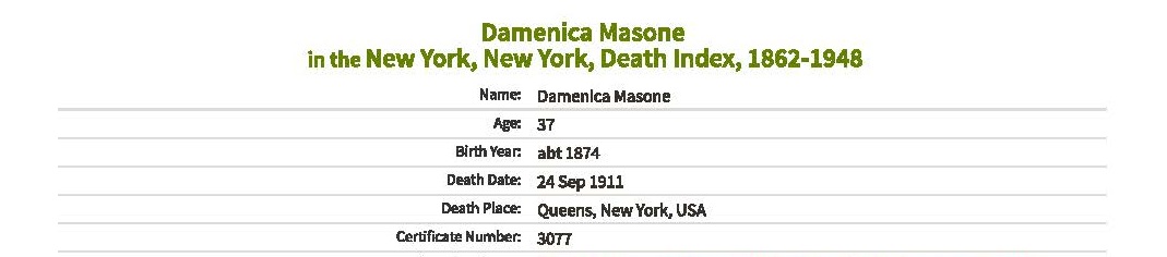 Serafino "Samuel" Masone were married in Italy. She died on September 24, 1911, at age 40, in Long Island, Queens, New York, USA.
