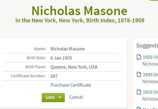 Nicholas Masone was born on January 8, 1903 in Queens, New York, USA. He and