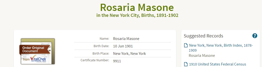 Rosaria "Rose" Masone was born on June 10, 1901 in New York, New York, USA. She and