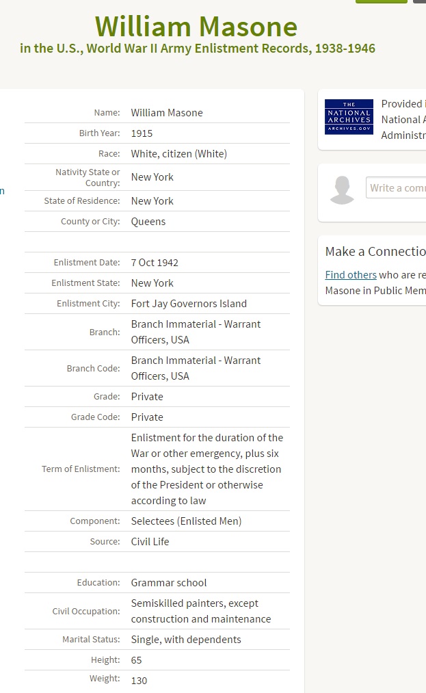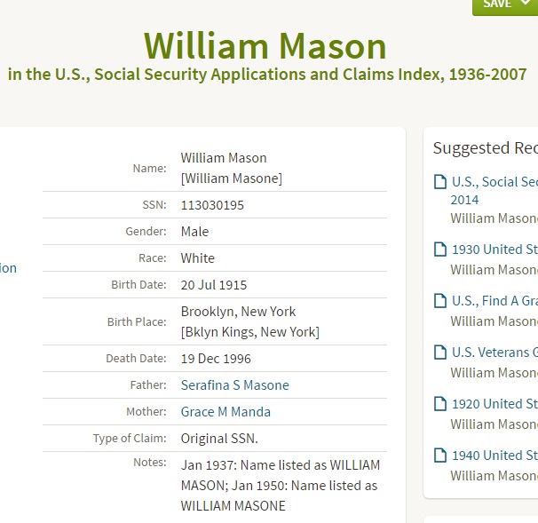 William Masone was born on July 20, 1915 in Brooklyn, Kings, New York, USA. He and