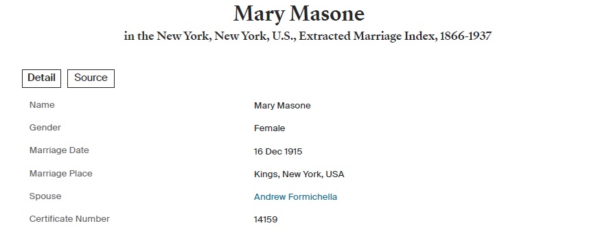 Serafino "Samuel" Masone were married on June 17, 1912 in Kings, New York, USA. She died.