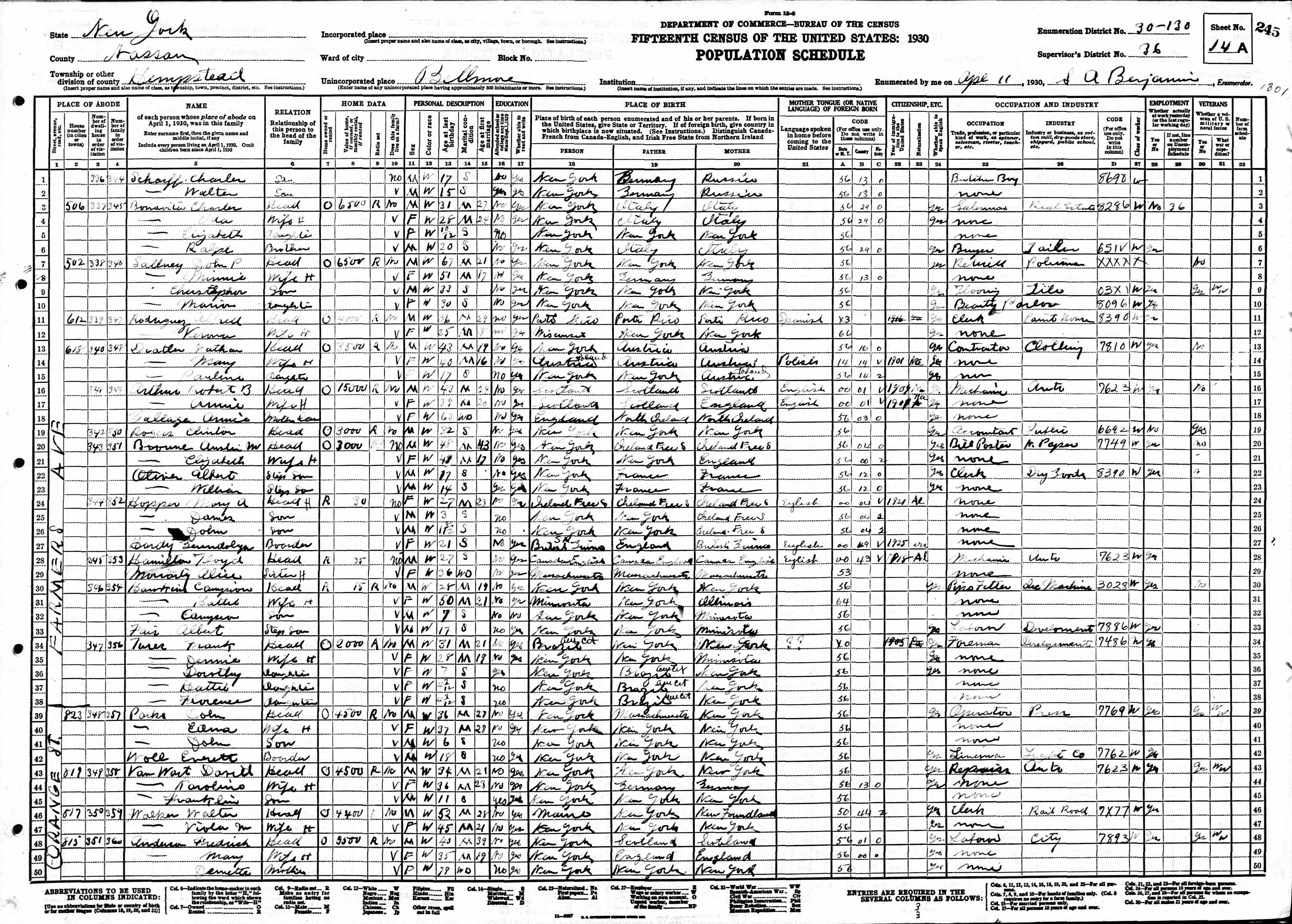 Clarke Family 1930 Federal Census New York, Lines 13-18