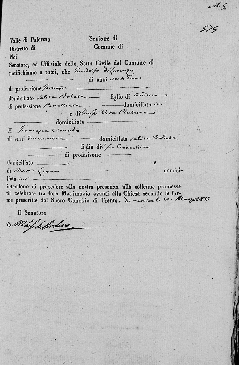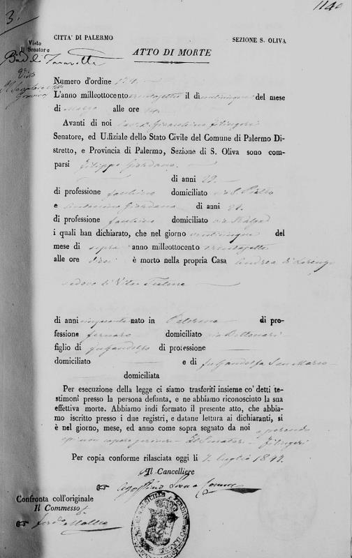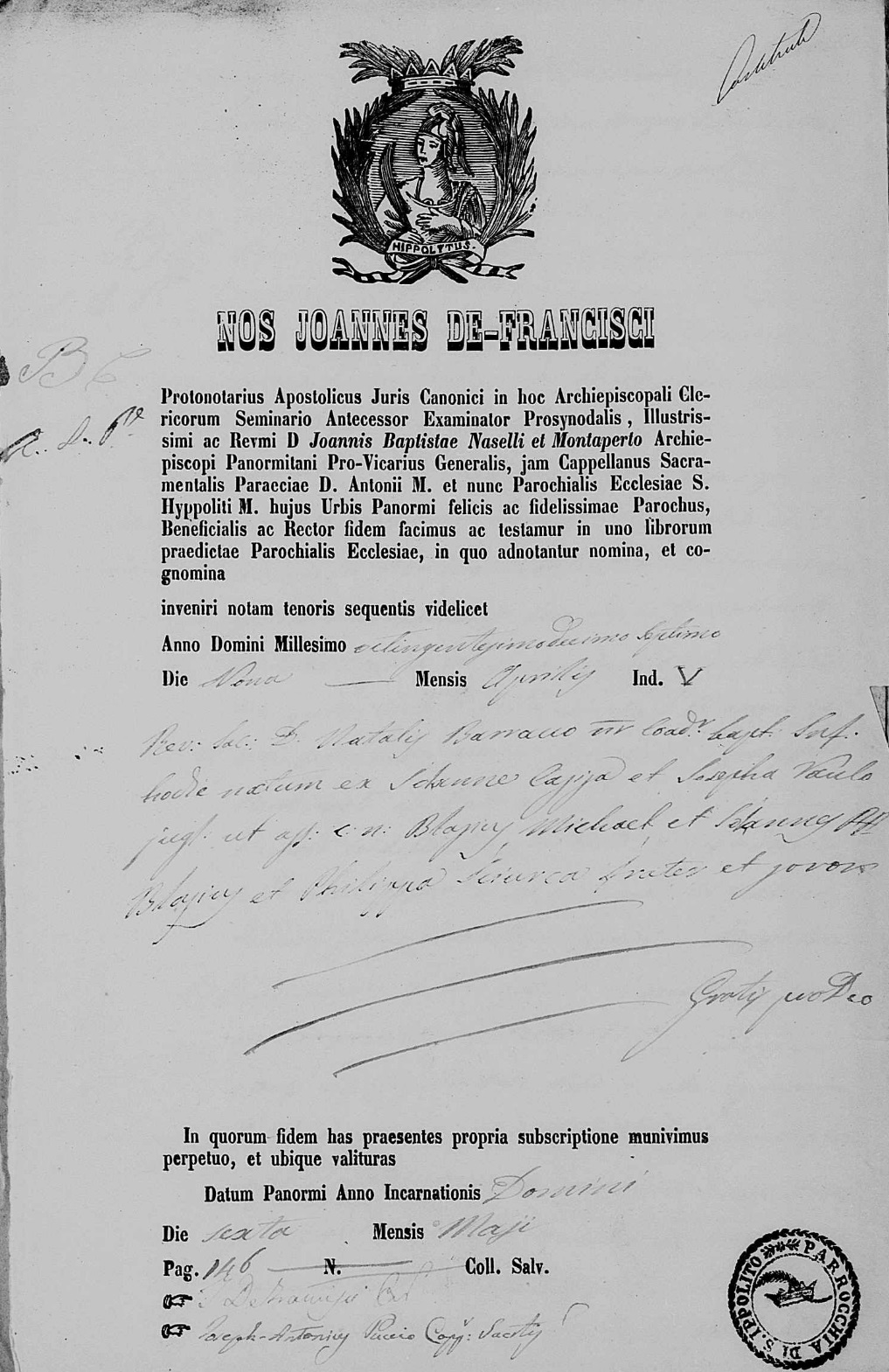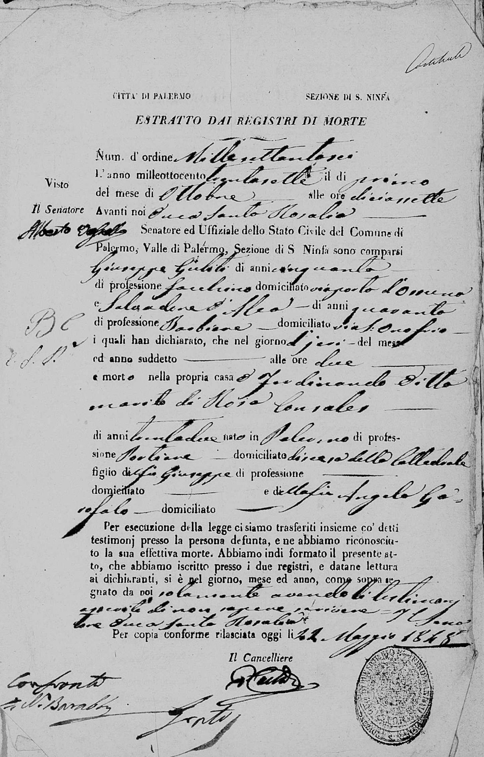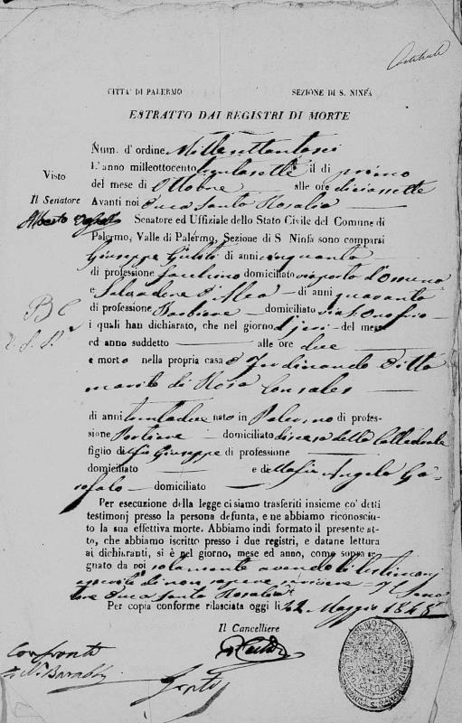 Francesca Ciraulo were married on March 31, 1833 in Santa Cristina, Palermo, Sicilia, Italy. He died on August 11, 1867, at age 56, in Palermo, Sicilia, Italy.