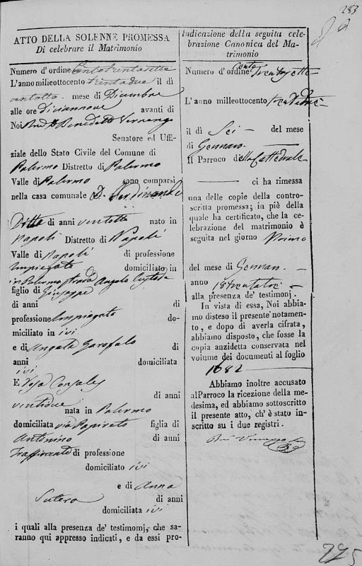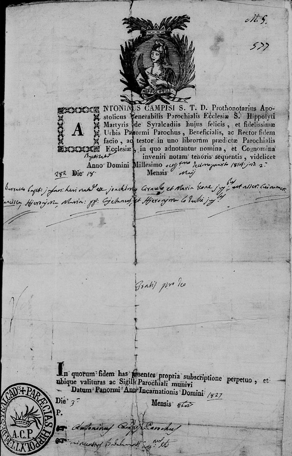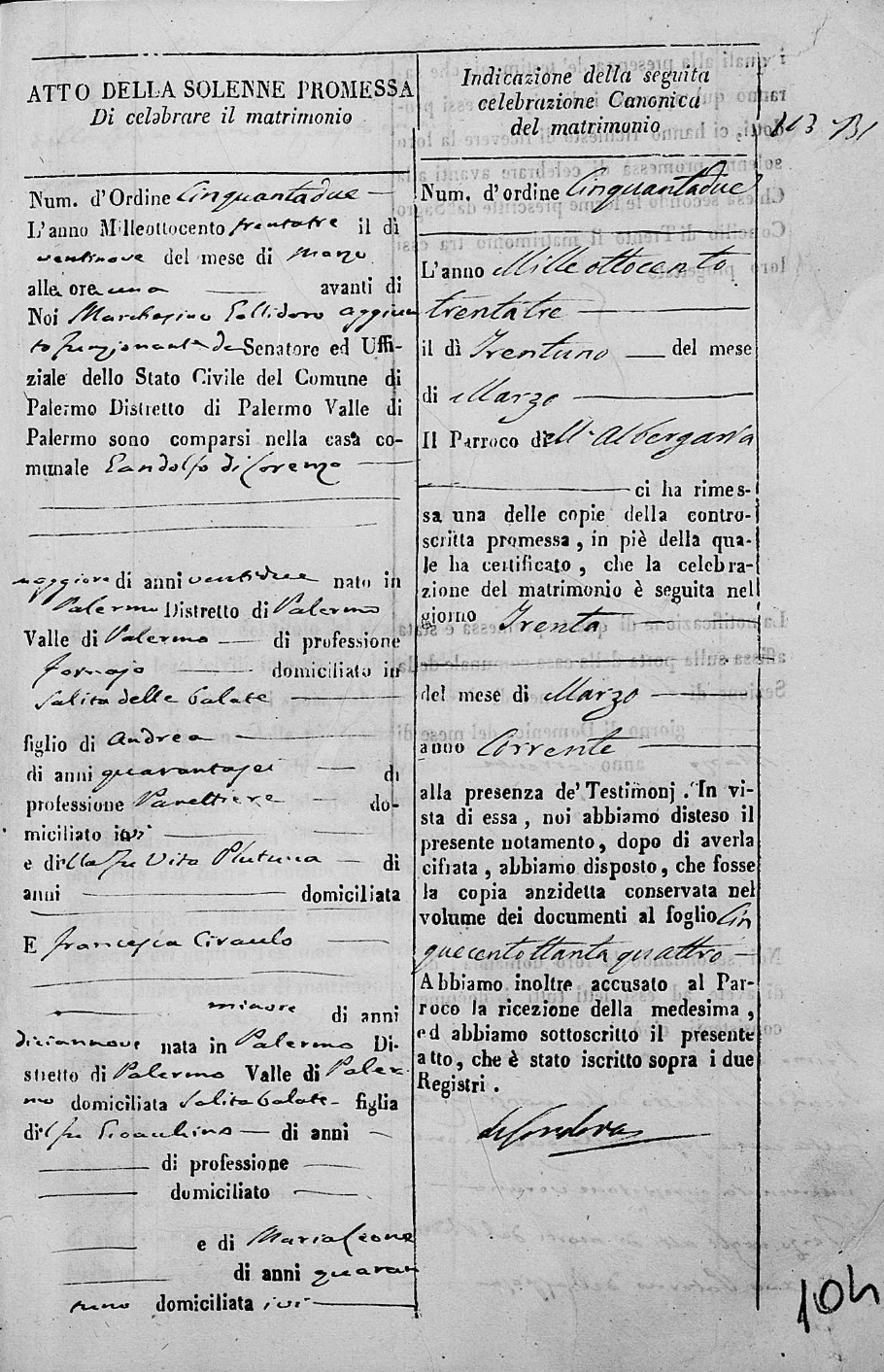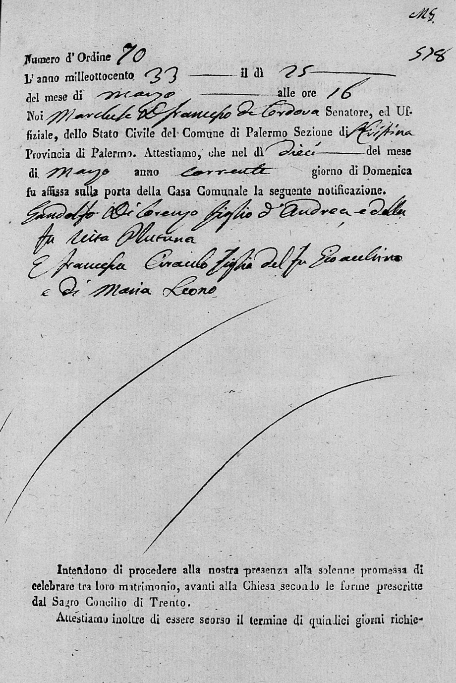 Francesca Ciraulo were married on March 31, 1833 in Santa Cristina, Palermo, Sicilia, Italy. He died on August 11, 1867, at age 56, in Palermo, Sicilia, Italy.