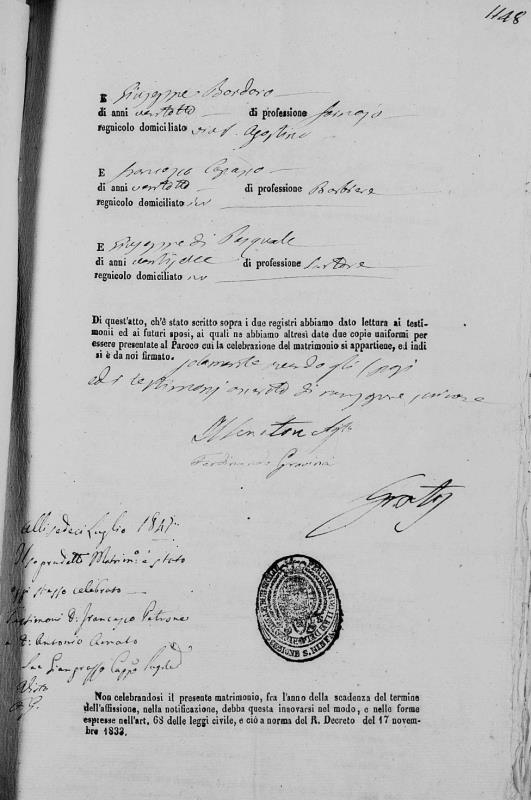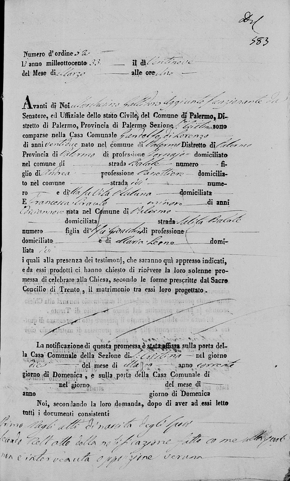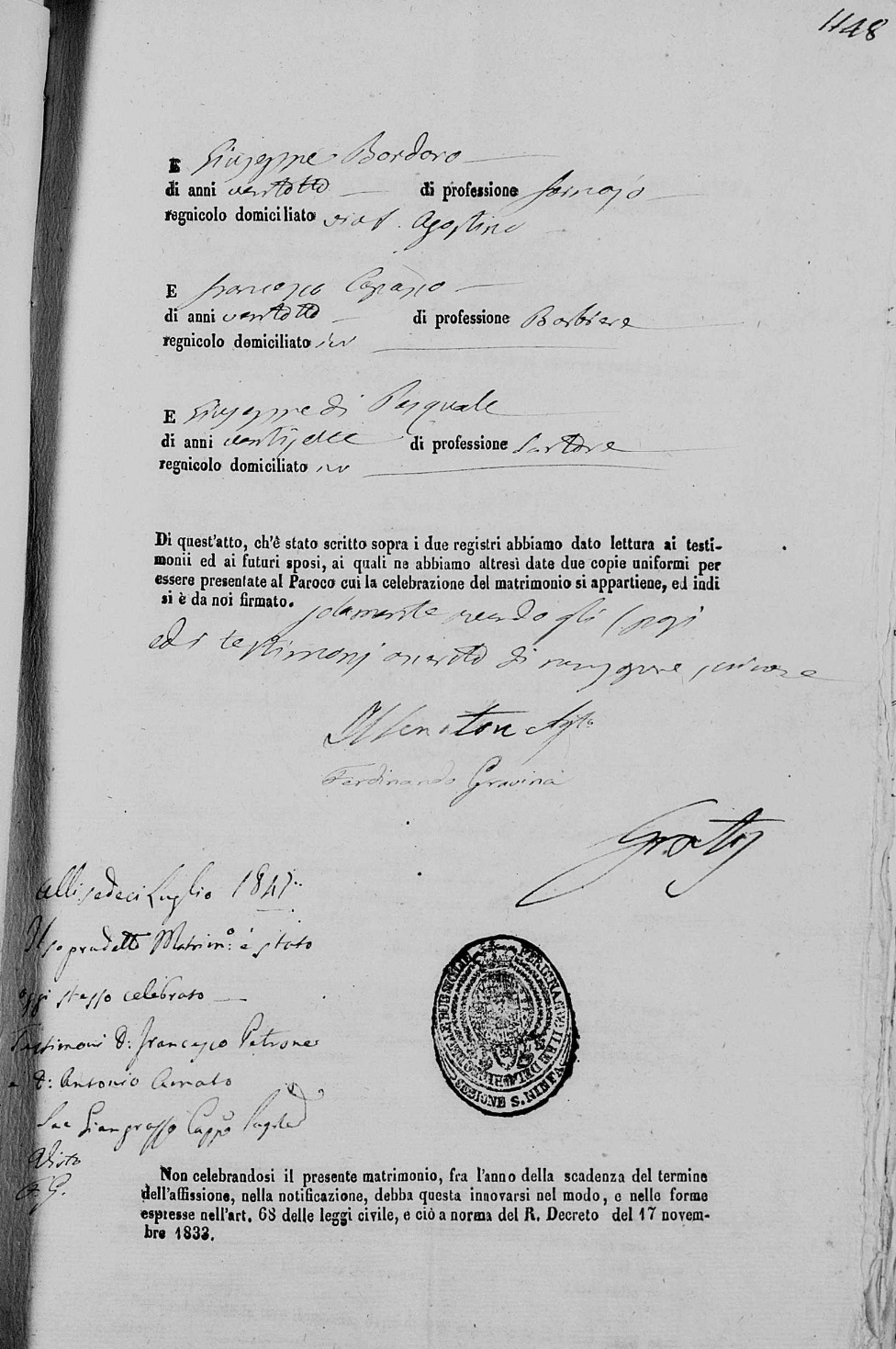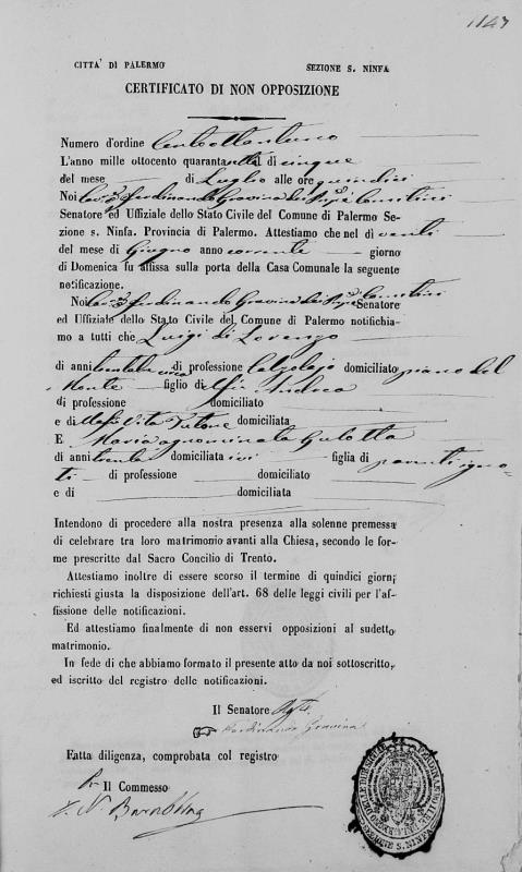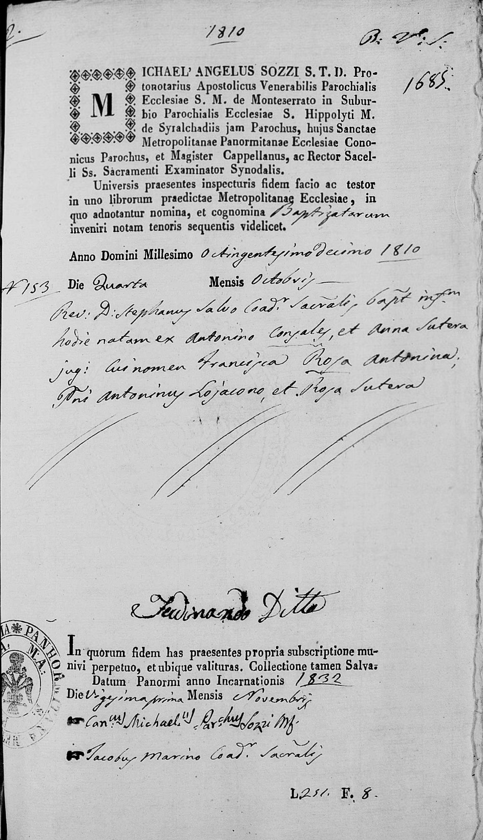 Francesca Ciraulo were married on March 31, 1833 in Santa Cristina, Palermo, Sicilia, Italy. He died on August 11, 1867, at age 56, in Palermo, Sicilia, Italy.