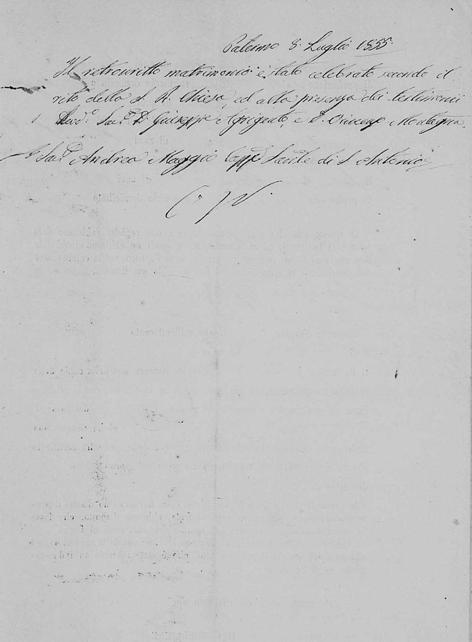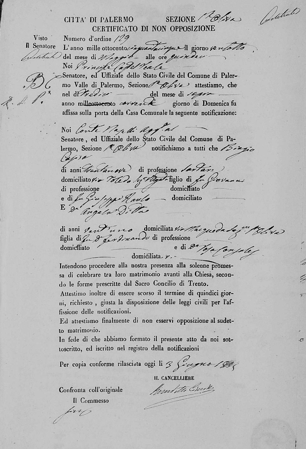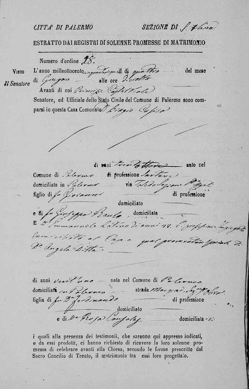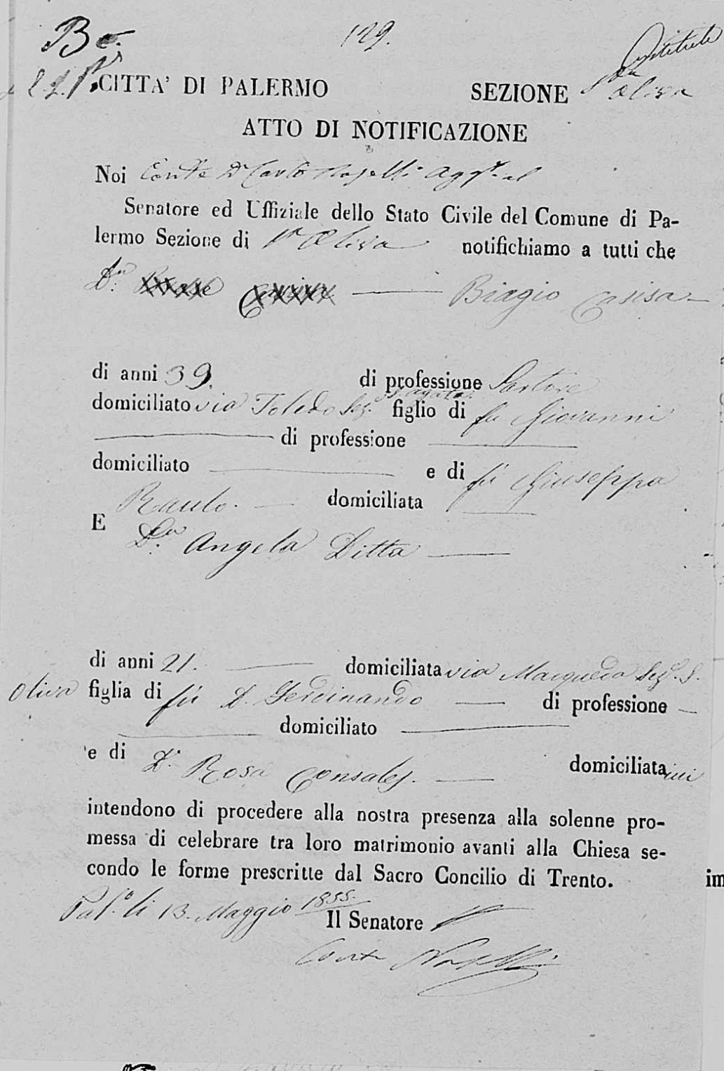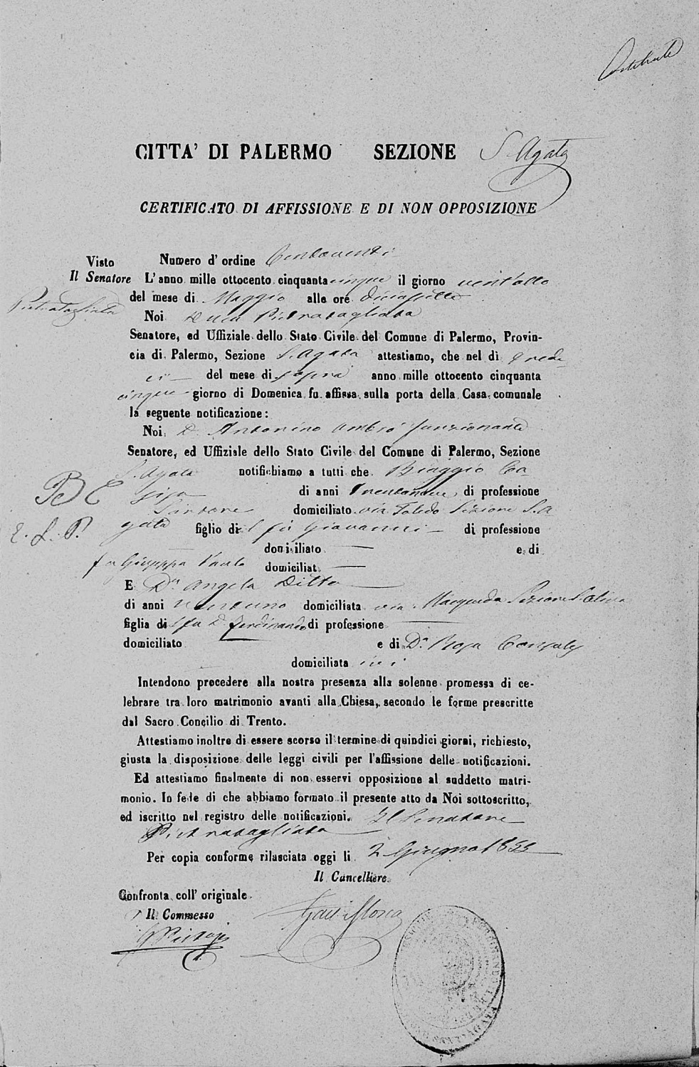 Angela Ditta were married on July 8, 1855 in Sant'Oliva, Palermo, Sicilia, Italy. He died.