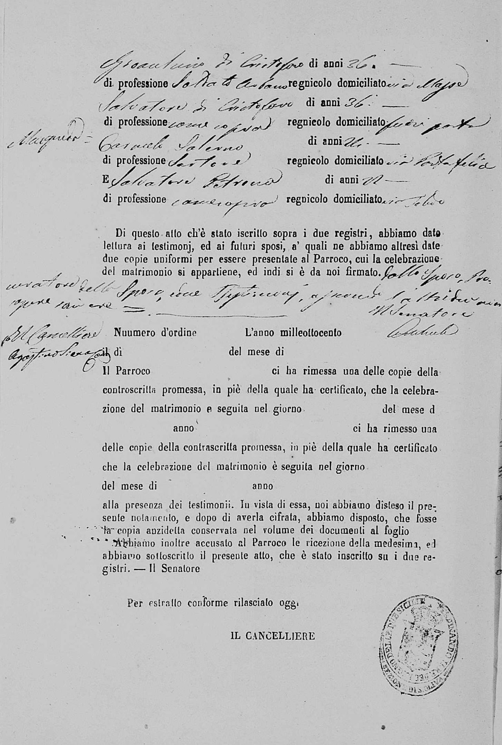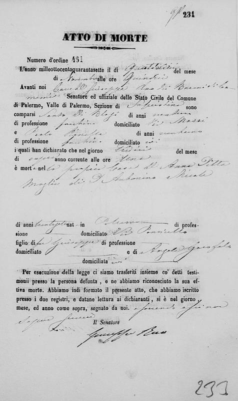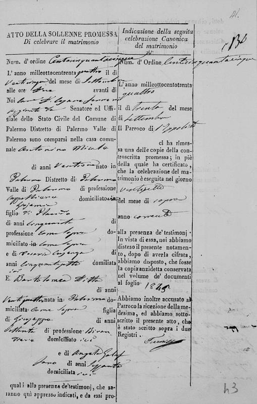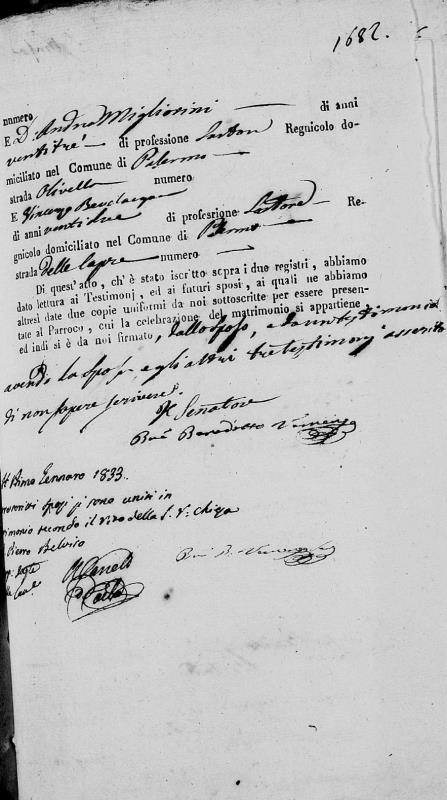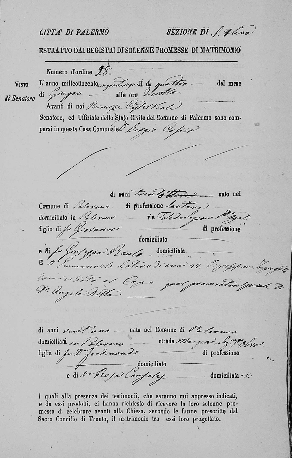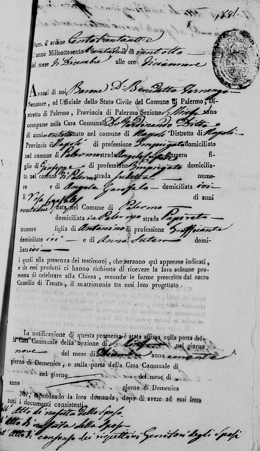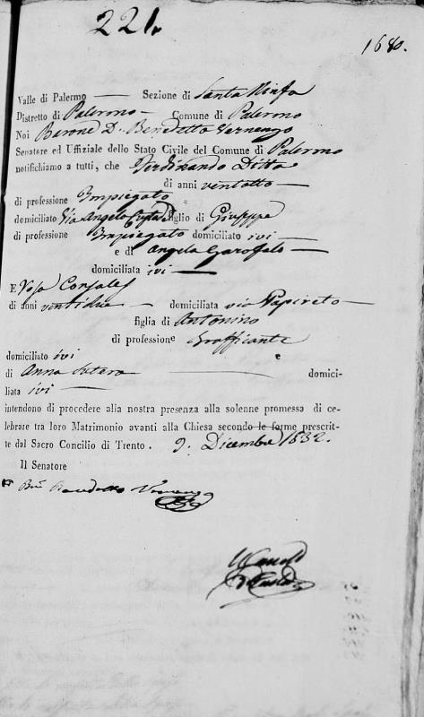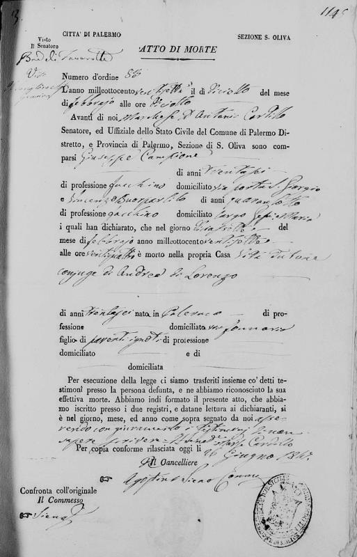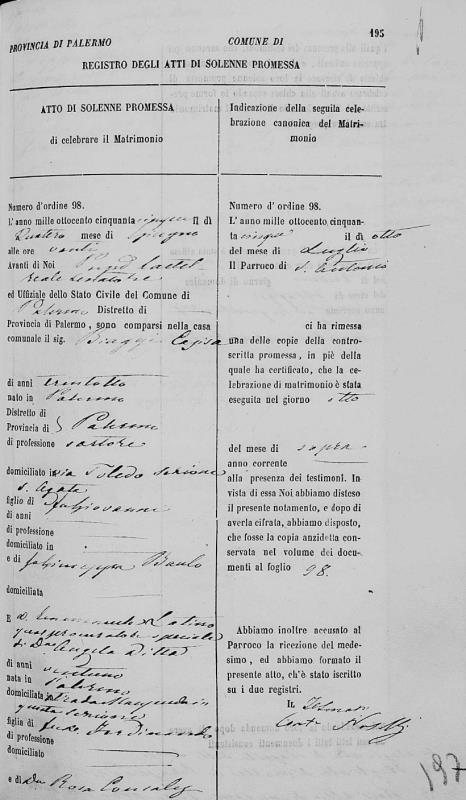 Angela Ditta were married on July 8, 1855 in Sant'Oliva, Palermo, Sicilia, Italy. He died.