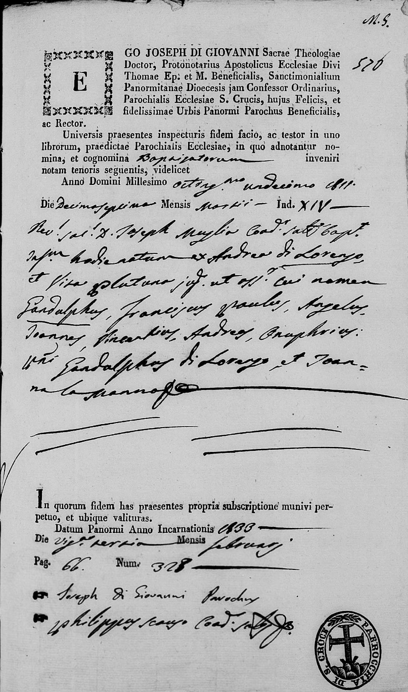 Gandolfo Di Lorenzo was born on March 16, 1811 in Palermo, Sicilia, Italy. He and
