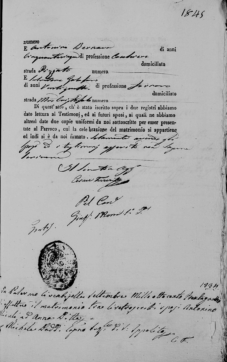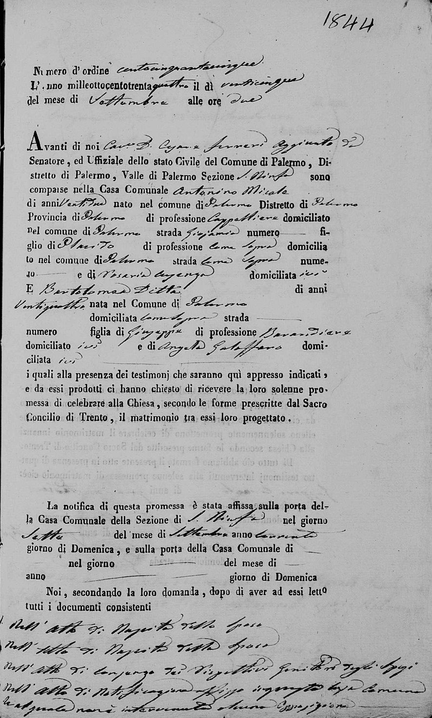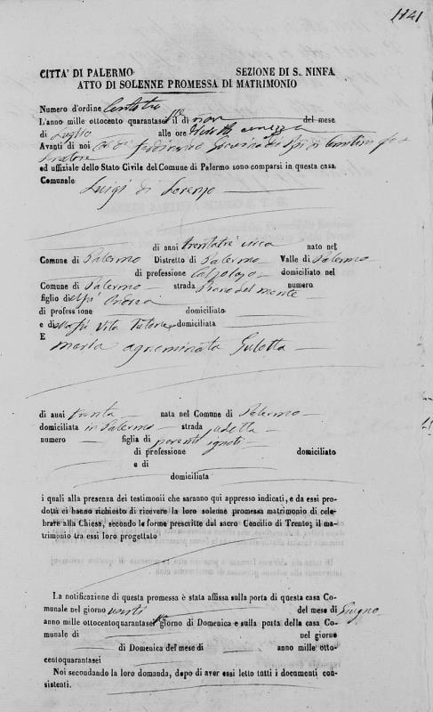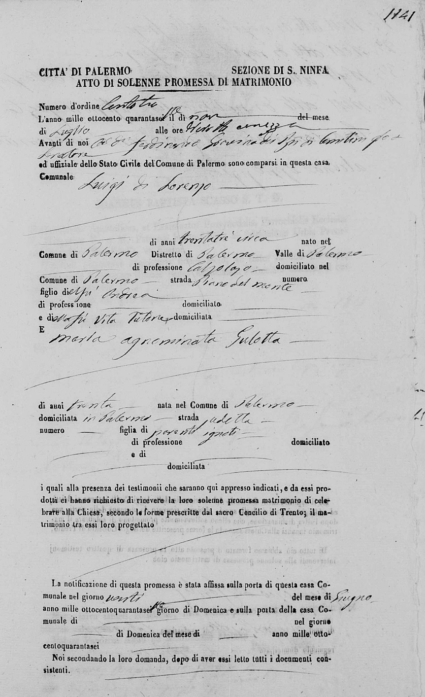 Maria Gulotta were married on July 12, 1847 in Santa Ninfa, Palermo, Sicilia, Italy. He died on October 8, 1849, at age 34, in Zisa, Palermo, Sicilia, Italy.