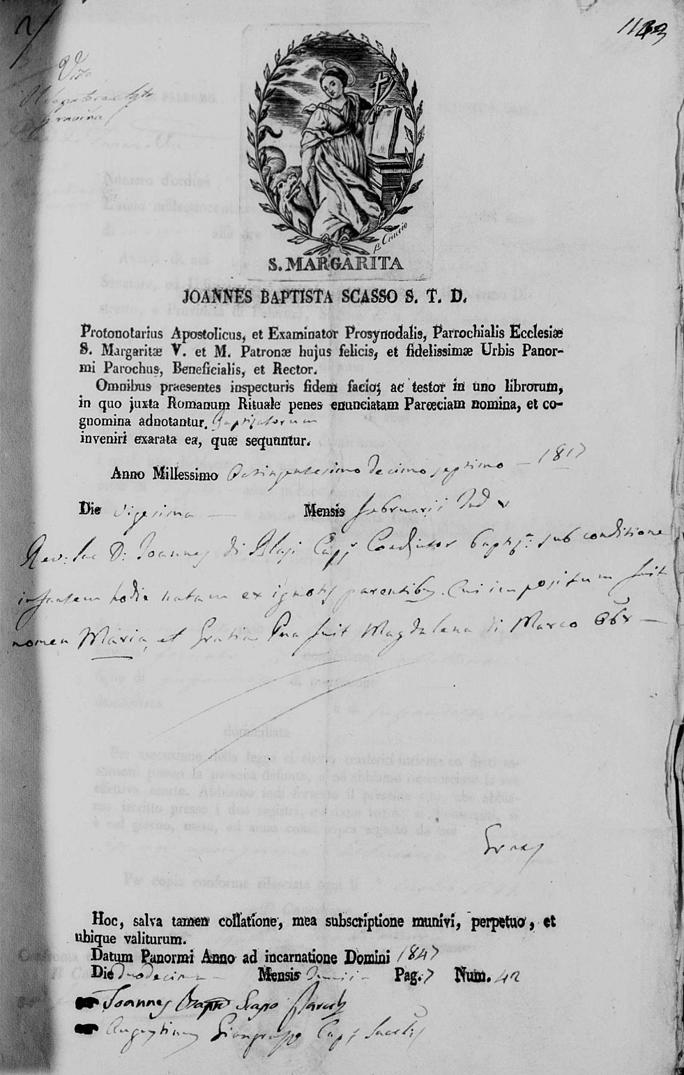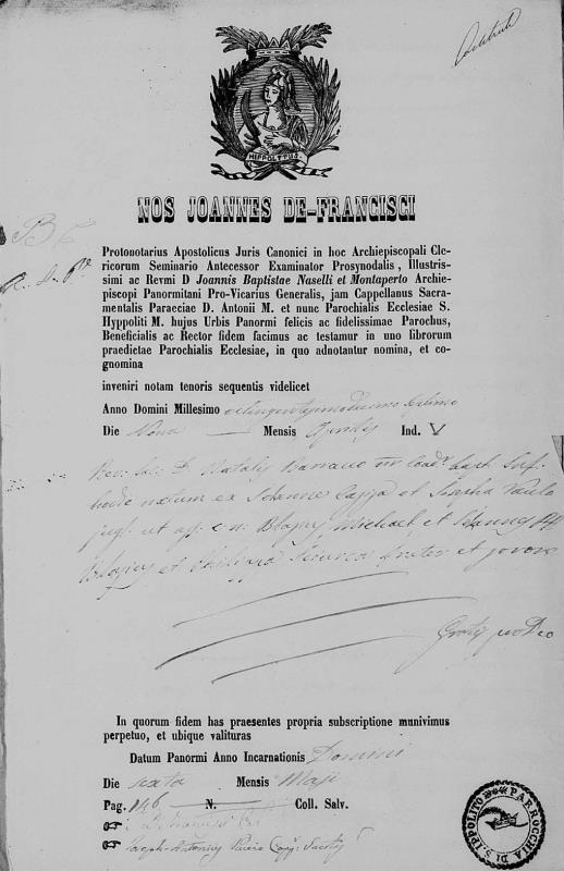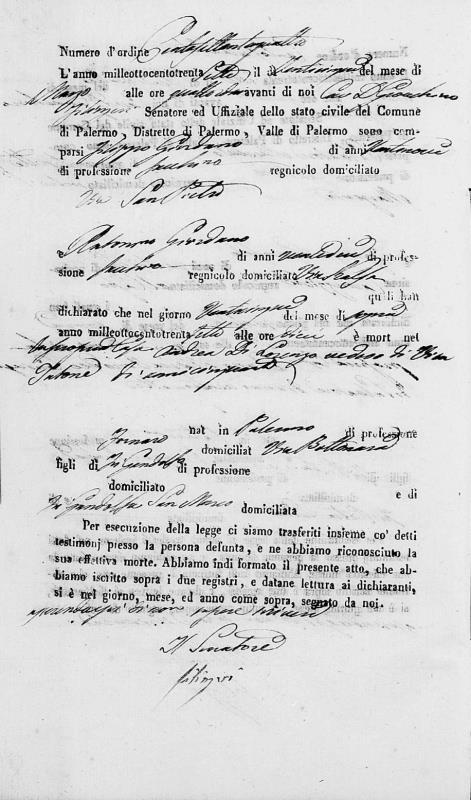 Giuseppa Ciraulo were married on November 1, 1837 in Sant'Oliva, Palermo, Sicilia, Italy. He died on January 11, 1894, at age ~76, in Palermo, Sicilia, Italy.