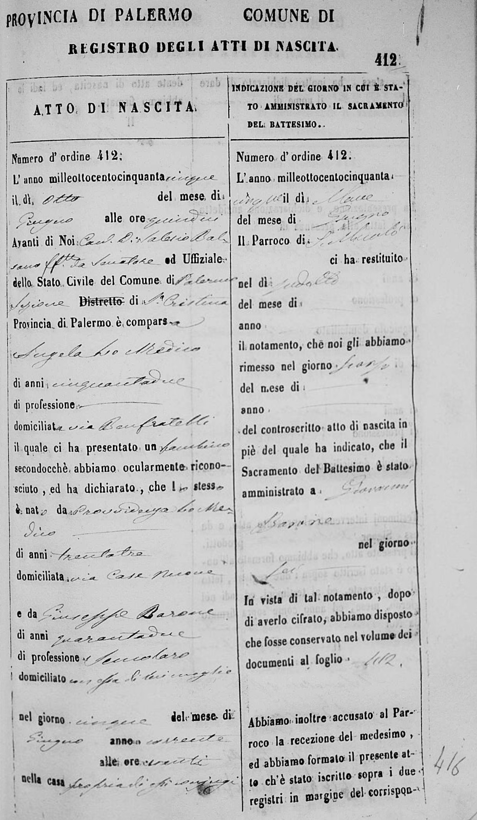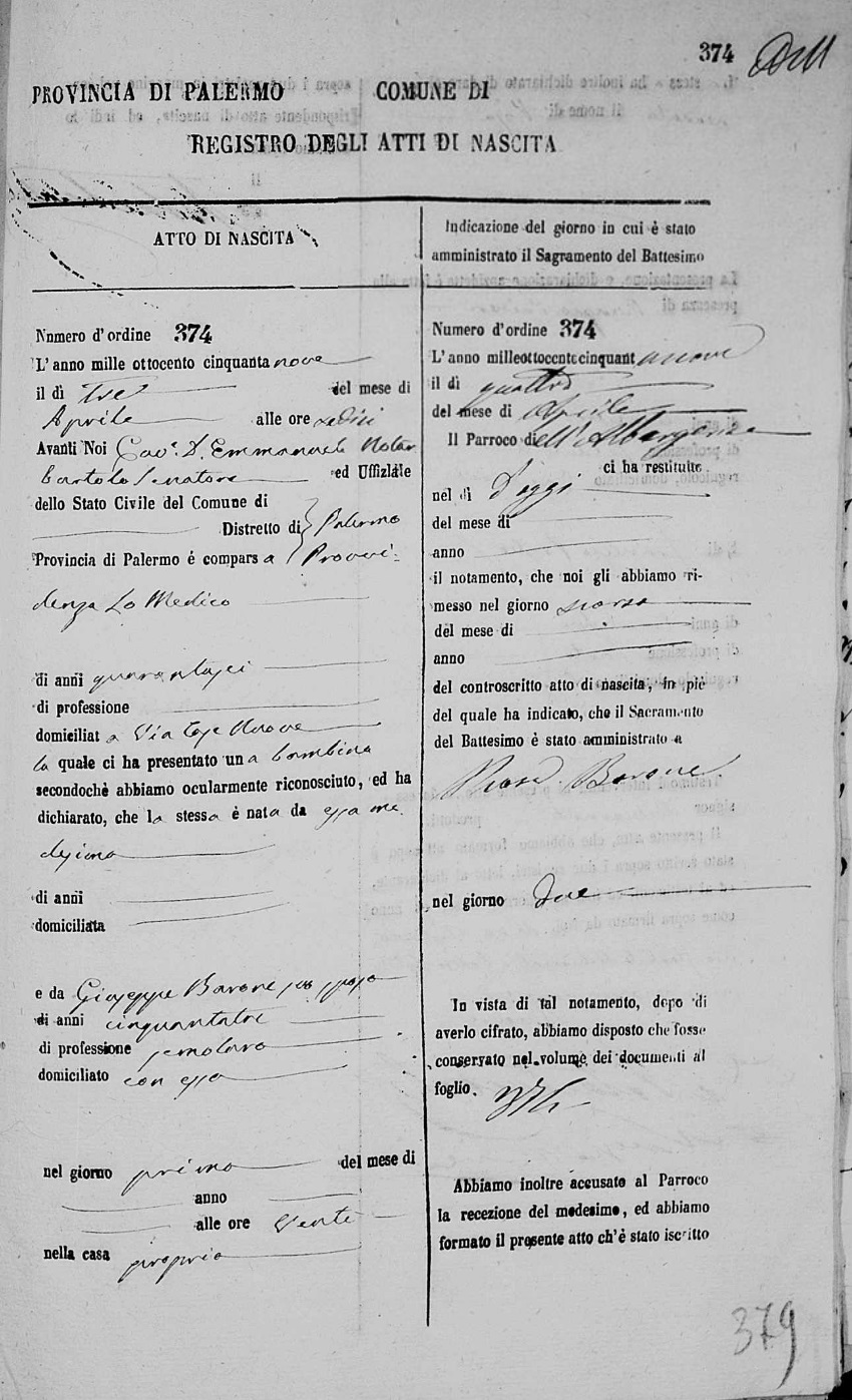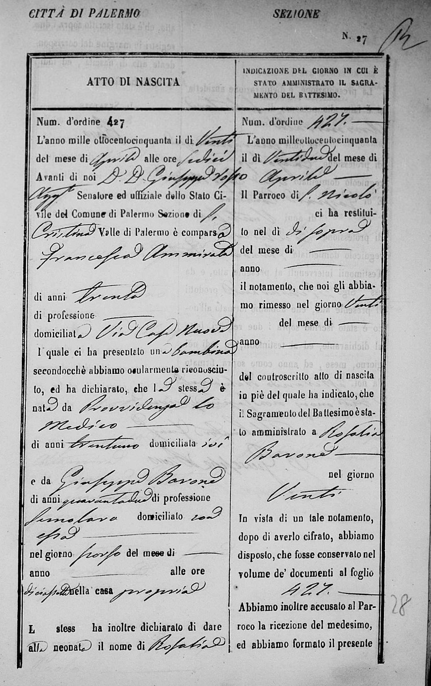 Rosalia Barone was born on April 20, 1850 in Santa Cristina, Palermo, Sicilia, Italy. She died.