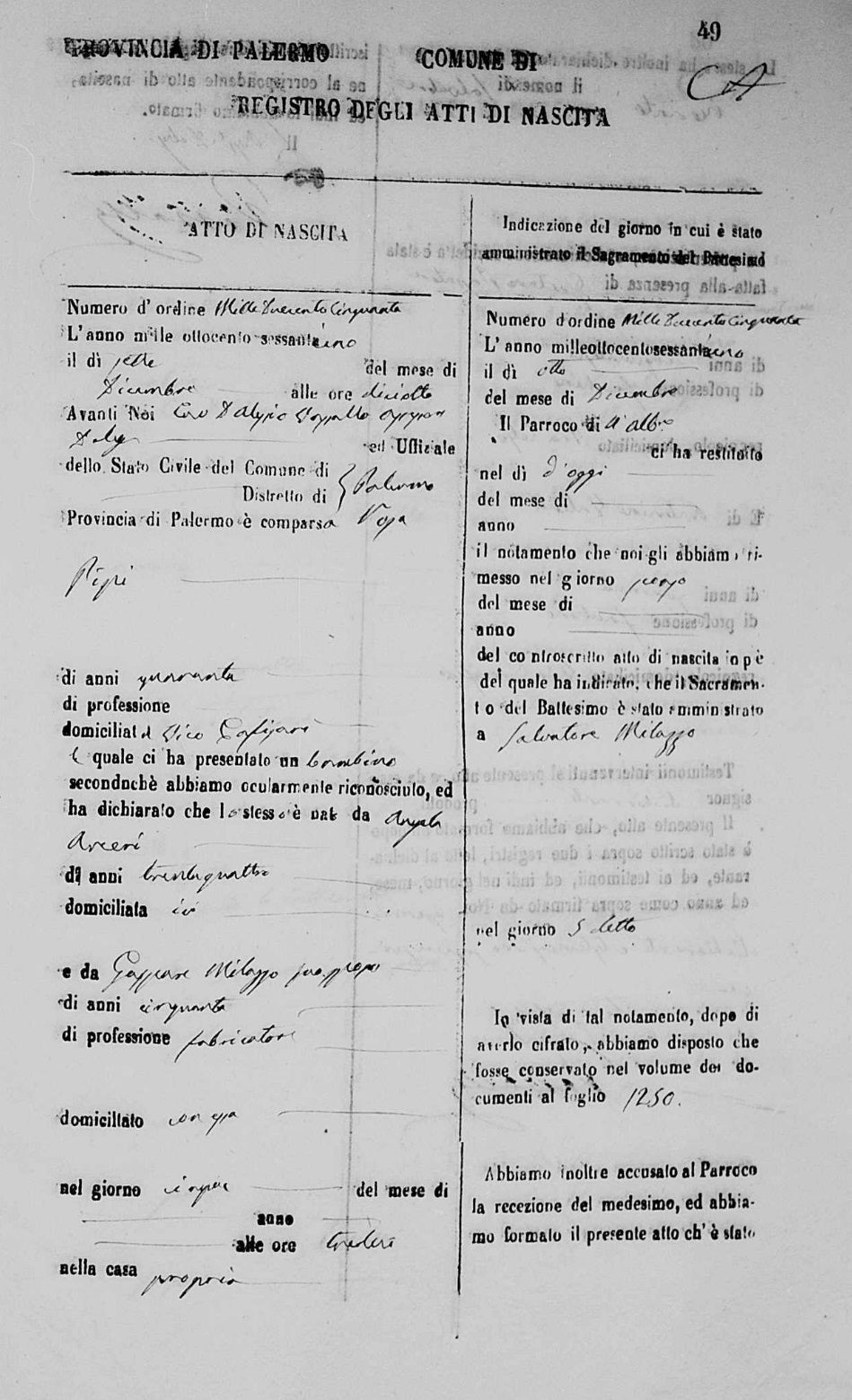Vincenzo Milazzo was born on September 25, 1843 in Santa Cristina, Palermo, Sicilia, Italy. He and