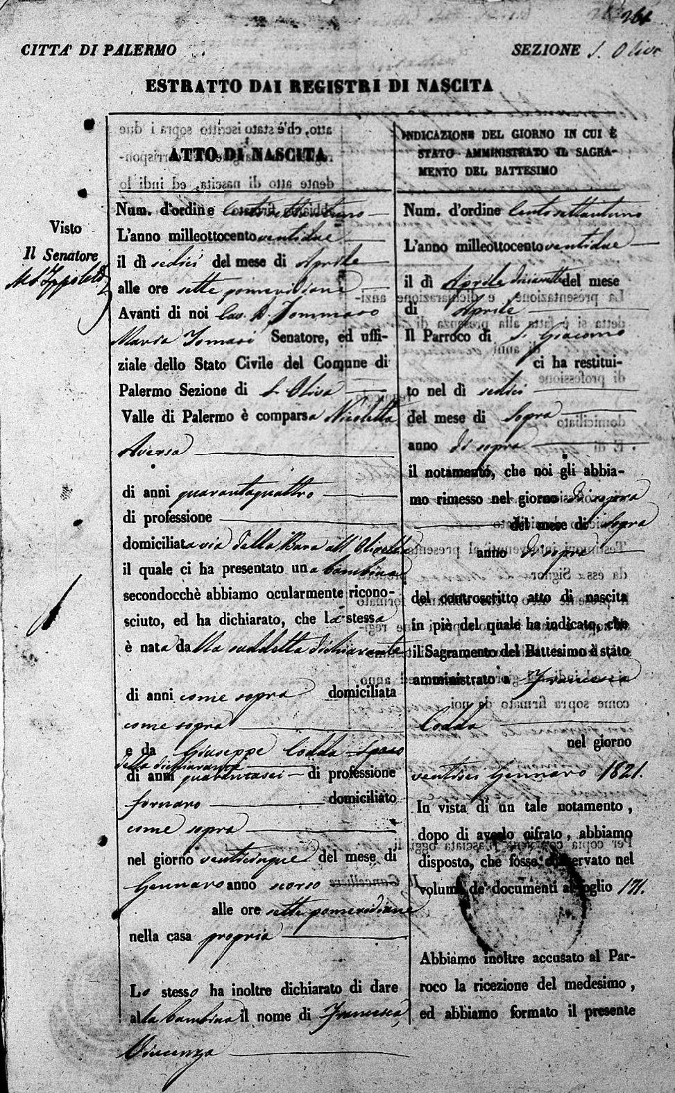 Giuseppa Lo Cascio was born on February 8, 1820 in Sant'Oliva, Palermo, Sicilia, Italy. She and