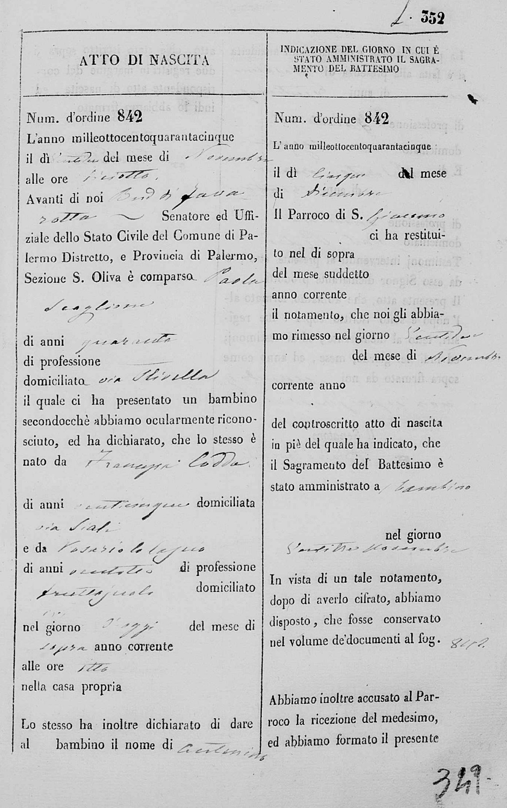 Francesca Vincenza Codda were married on February 7, 1842 in Molo, Palermo, Sicilia, Italy. He died on January 8, 1864, at age 45, in Palermo, Sicilia, Italy.