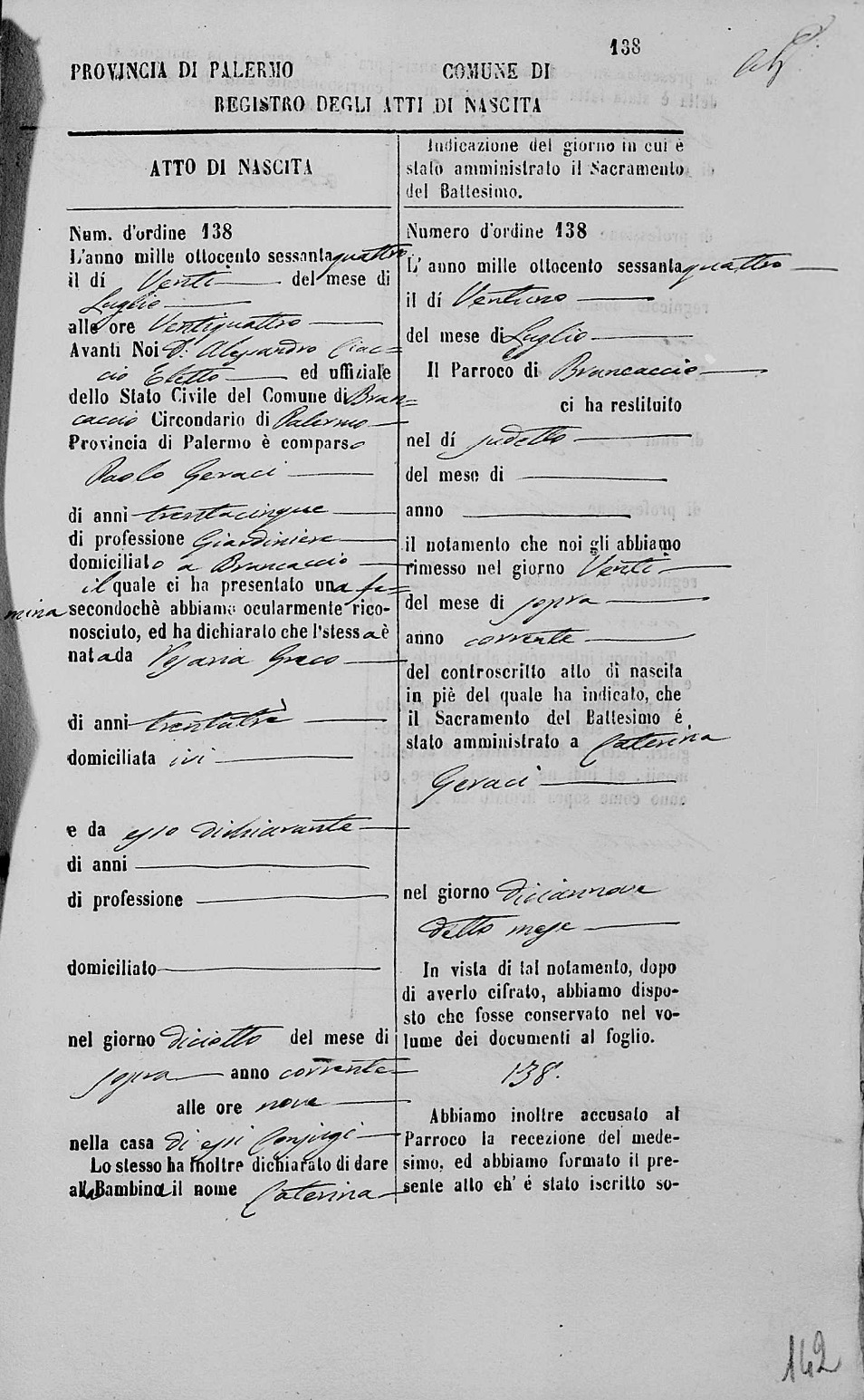 Caterina Geraci was born on July 18, 1864 in Brancaccio, Palermo, Sicilia, Italy. She and