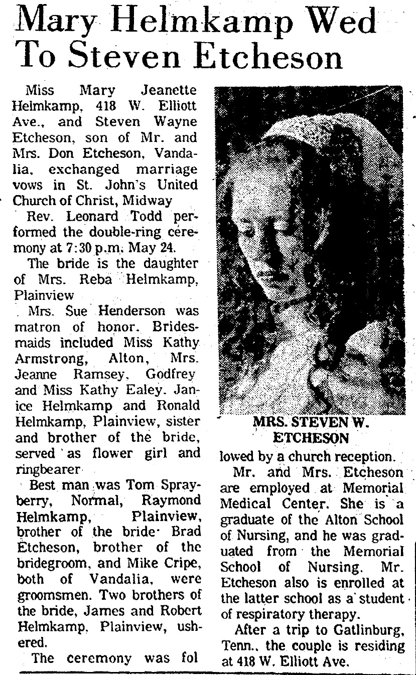 Steven Wayne Etcheson were married on May 24, 1974 in Midway, Massac, Illinois, USA.