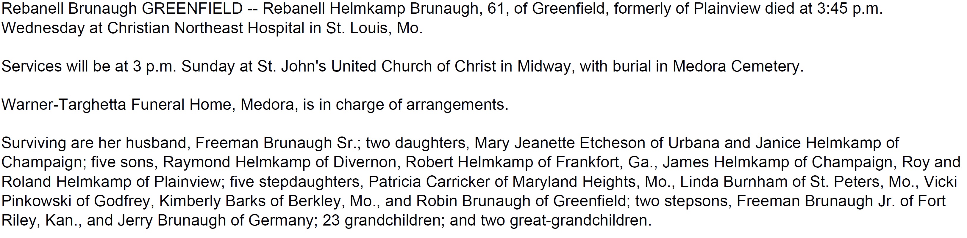 Raymond William Helmkamp were married on August 15, 1948 in Moro, Madison, Illinois, USA. She died on December 23, 1987, at age 61, in St. Louis, Missouri, USA. She was buried in Medora Cemetery, Ruyle, Illinois.