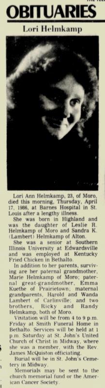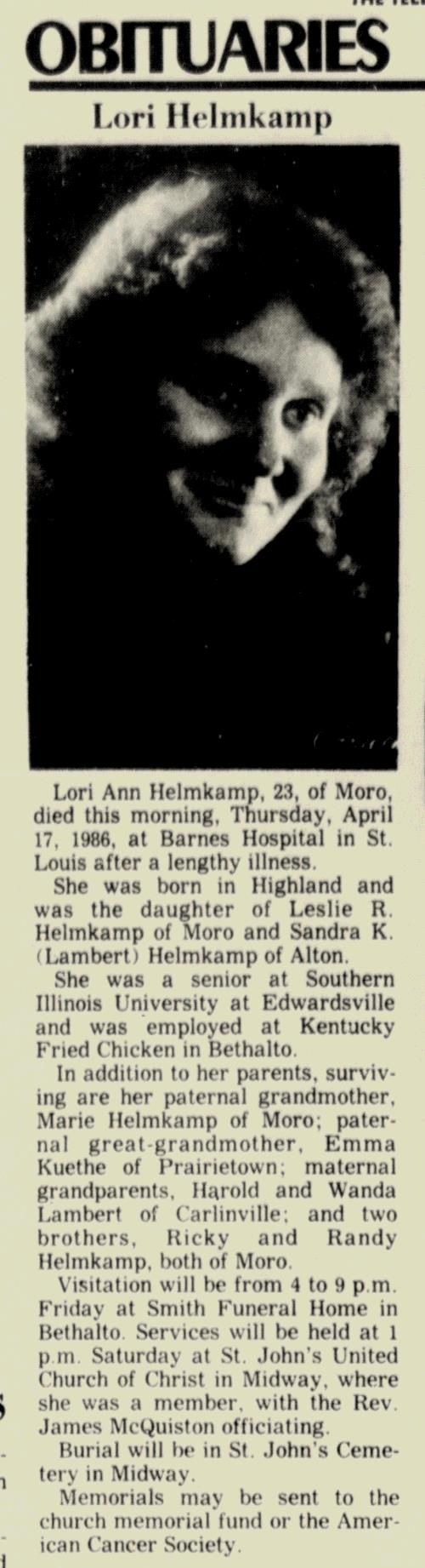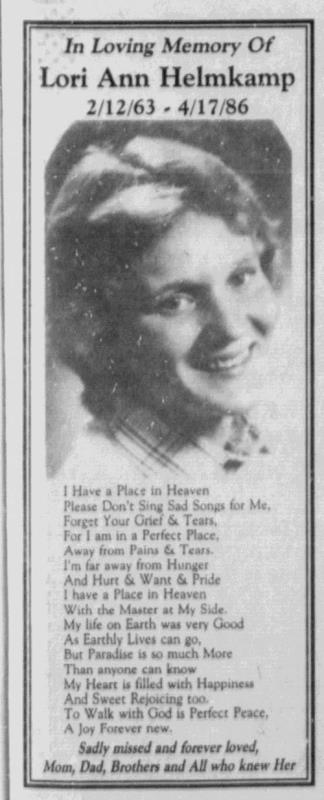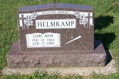 Lori Ann Helmkamp was born on February 12, 1963 in Highland, Madison, Illinois, USA. She died on April 17, 1986, at age 23, in St. Louis, Missouri, USA. She was buried in Saint John United Church of Christ Cemetery, Midway, Illinois.