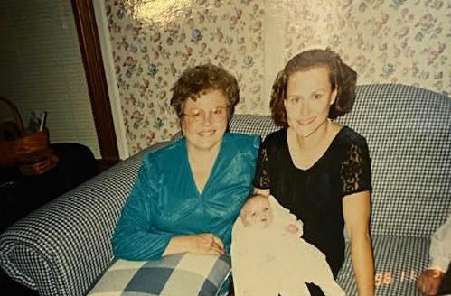 Sue Ellen Helmkamp holding Crystalle Rayborn, Sheryl Helmkamp holding Matt Langiano, and Debbie Dyment holding Laura Helmkamp