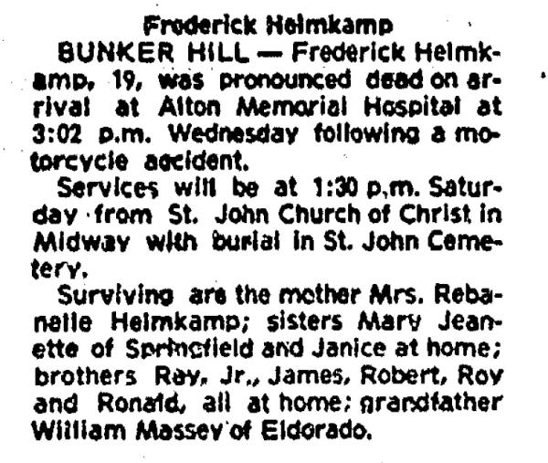 Frederick George Helmkamp was born on April 16, 1954. He died on September 26, 1973, at age 19, in Midway, Massac, Illinois, USA. He was buried in Saint John United Church of Christ Cemetery, Midway, Illinois.