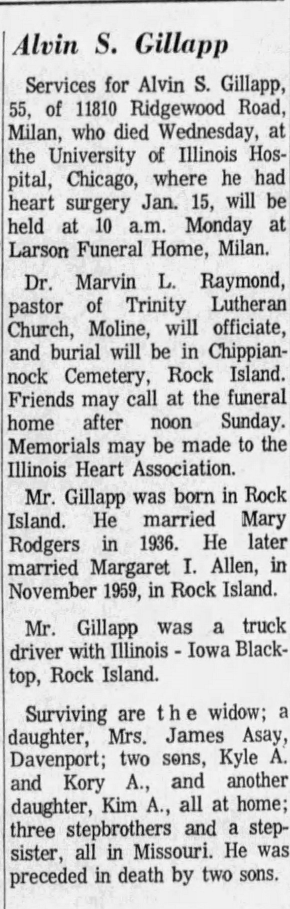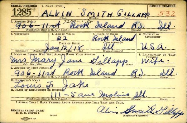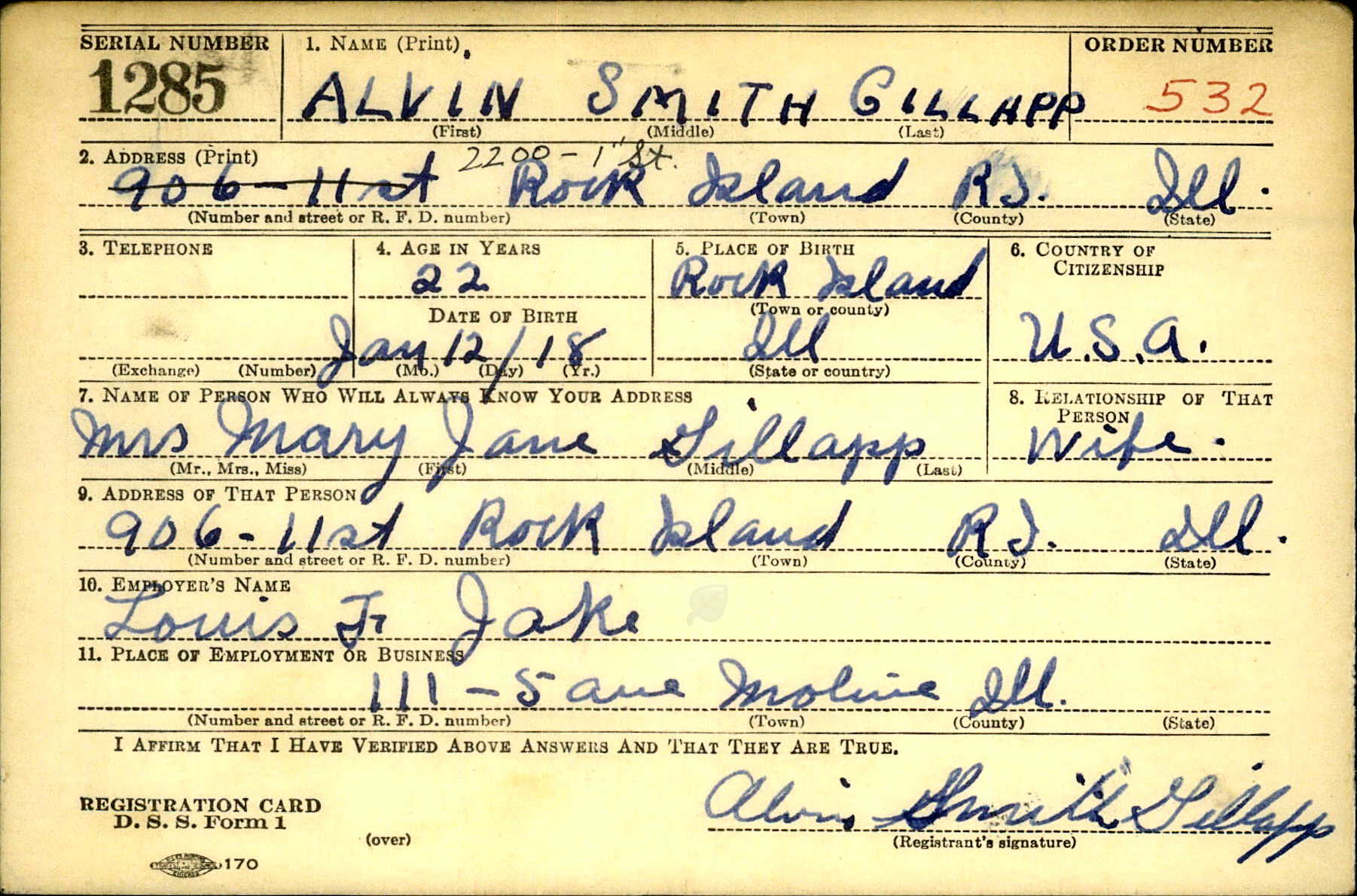 Alvin Smith Gillapp was born on January 12, 1918 in Rock Island, Rock Island, Illinois, USA. He and