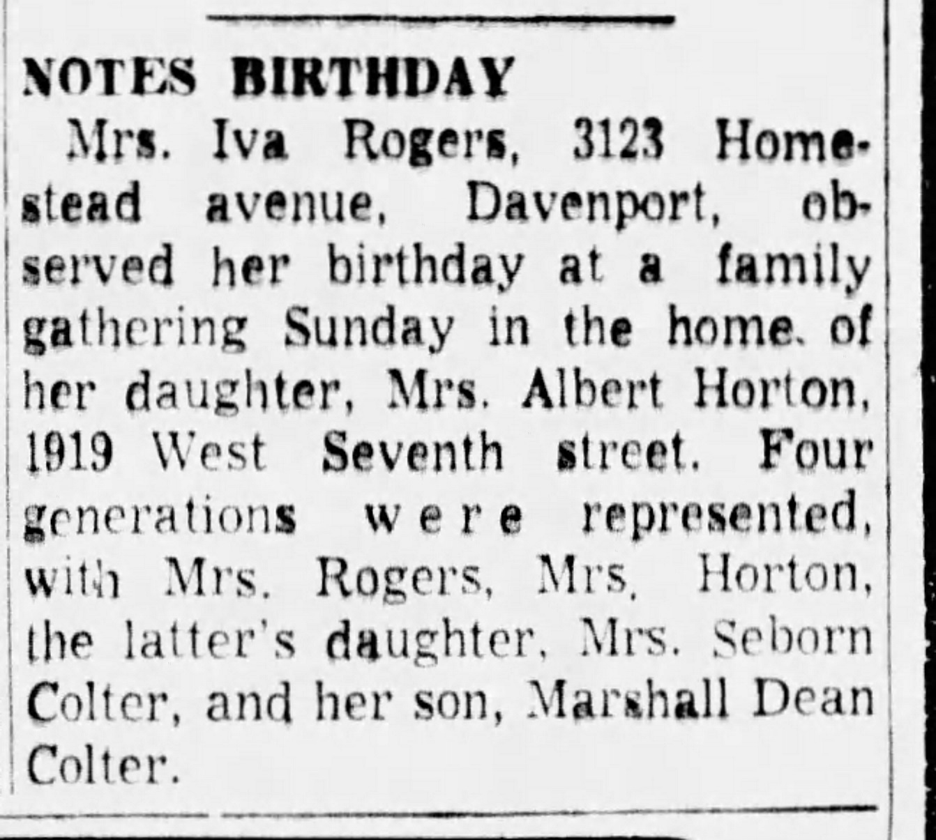 Harry Arthur Rogers were married. She died on October 23, 1974, at age 83. She was buried in Fairmount Cemetery, Davenport, Iowa.