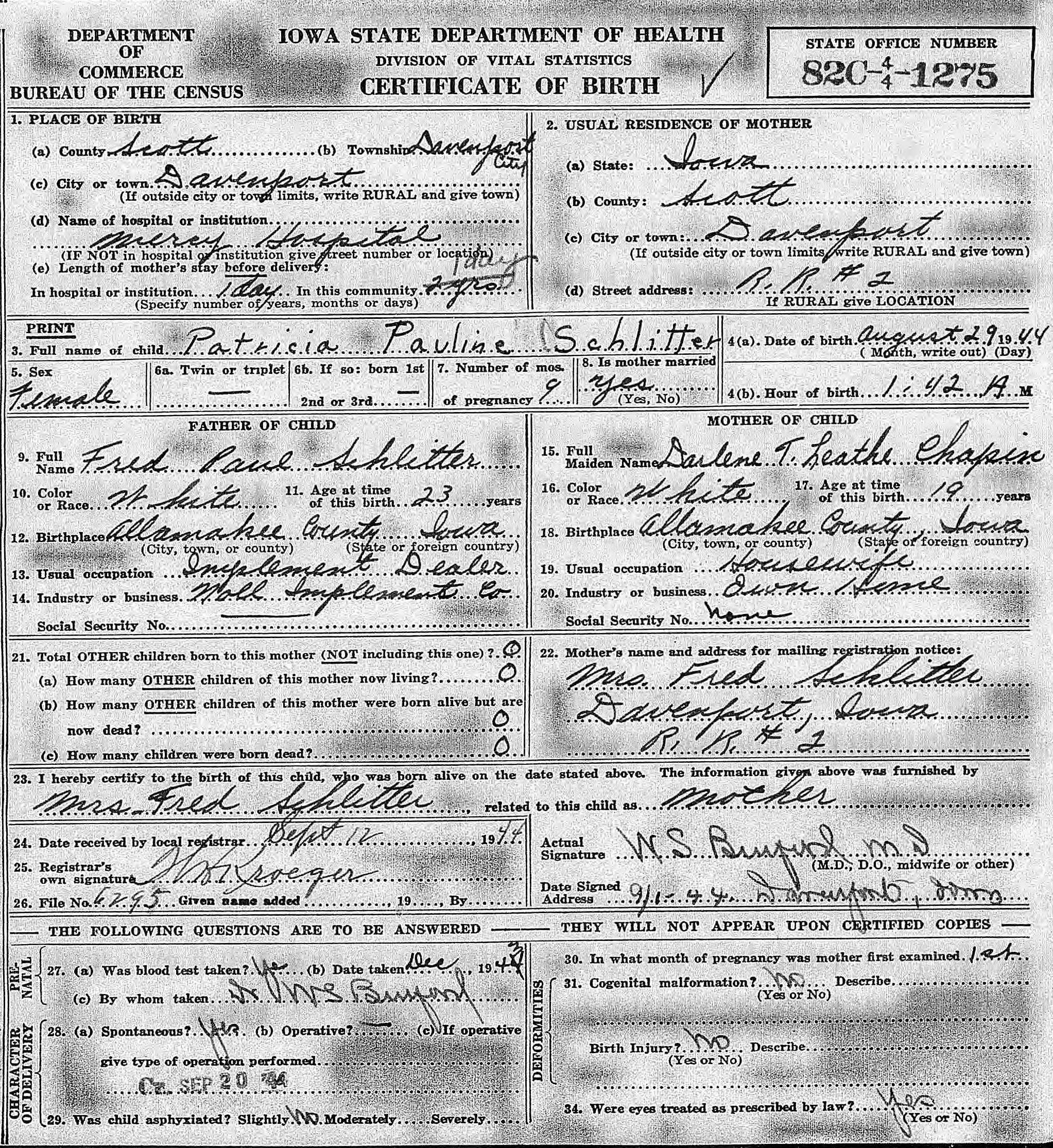 Patricia Pauline Schlitter was born on August 29, 1944 in Davenport, Scott, Iowa, USA. She and