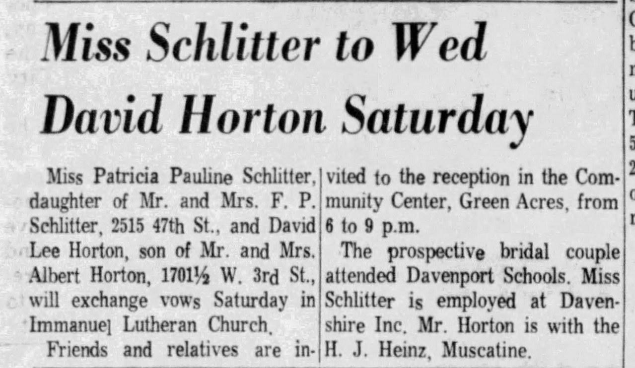 David Lee Horton were married on September 23, 1961 in Davenport, Scott, Iowa, USA. She died on March 18, 2007, at age 62, in Bettendorf, Scott, Iowa, USA. She was buried in Cremation.