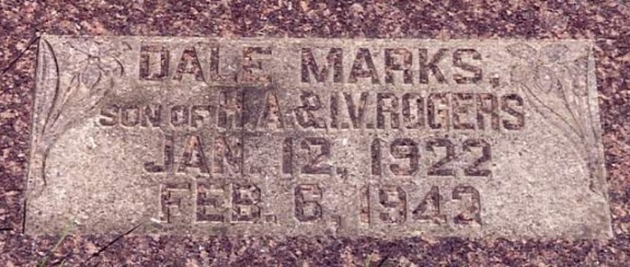 Dale Marks Rogers was born on January 12, 1922 in Hannibal, Marion, Missouri, USA. He died on February 6, 1942, at age 20, in Davenport, Scott, Iowa, USA. He was buried in Fairmount Cemetery, Davenport, Iowa.