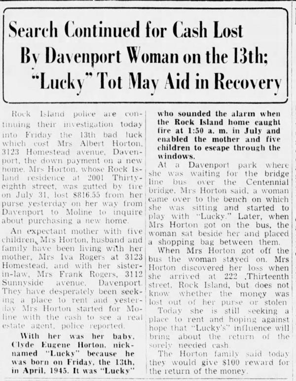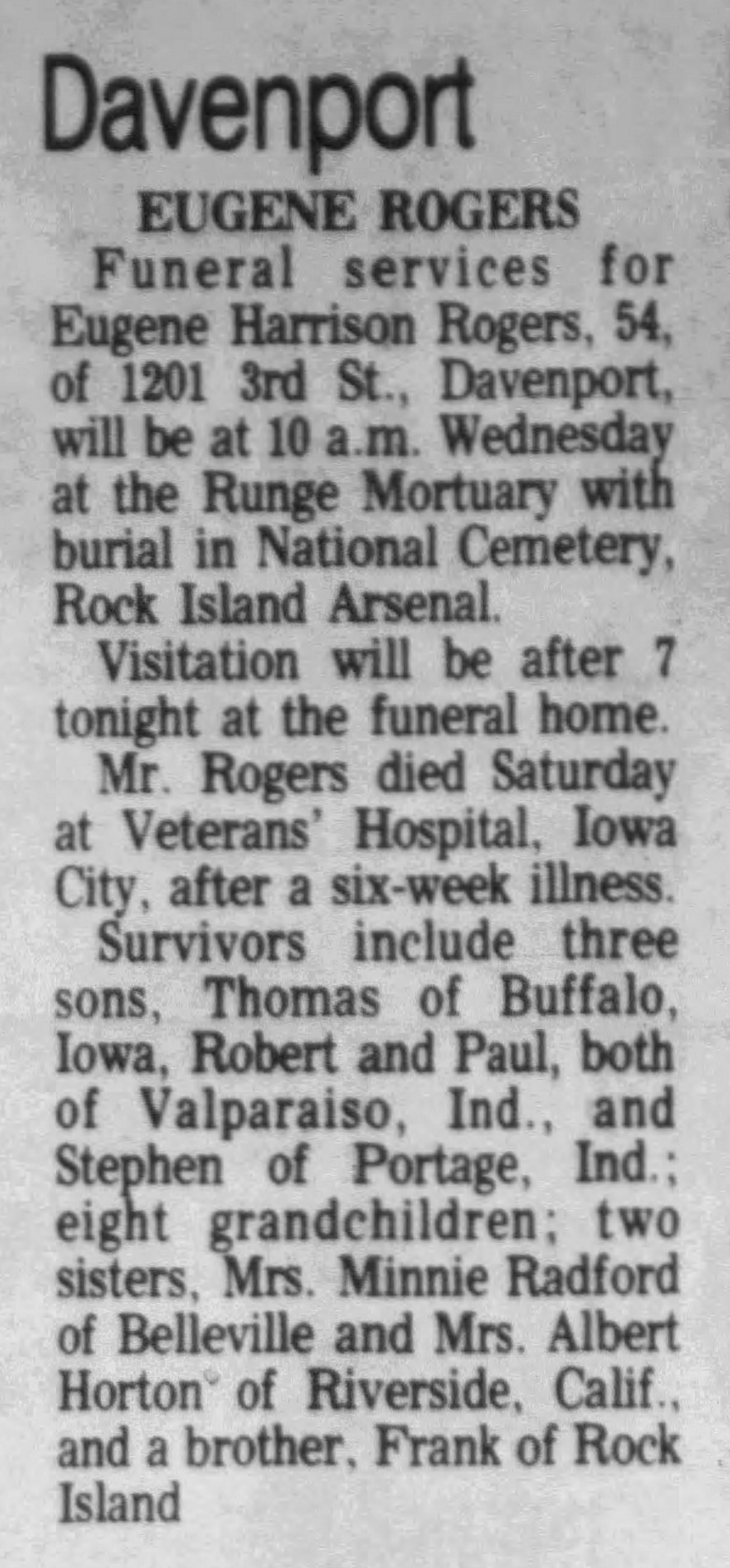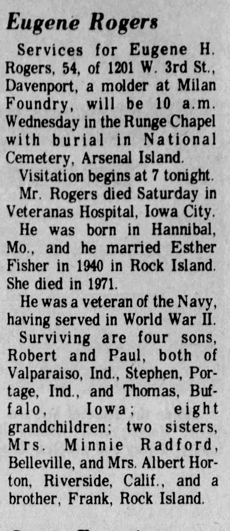 Esther Lucille Fisher were married on February 24, 1941 in Scott, Iowa, USA. He died on November 9, 1974, at age 54, in Iowa City, Johnson, Iowa, USA. He was buried in Rock Island National Cemetery, Rock Island, Illinois.