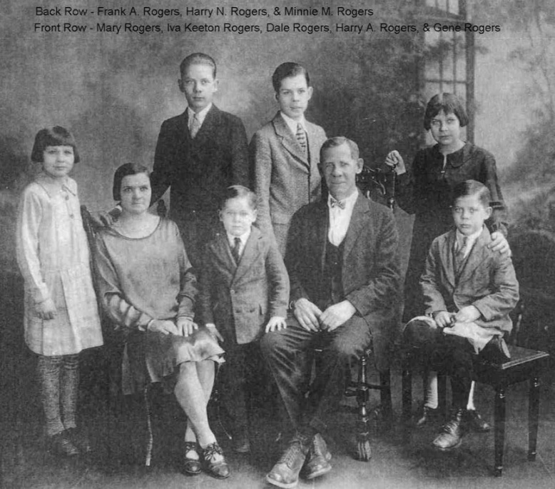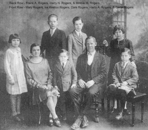 Mary Rogers, Iva Keeton, Frank, Dale, Harry Jr., Harry Sr., Minnie, and Eugene Rogers