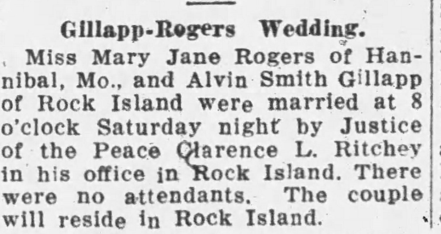 Alvin Smith Gillapp were married on October 12, 1935 in Rock Island, Rock Island, Illinois, USA. She and