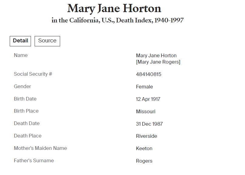 Mary Jane Rogers was born on April 12, 1917 in Clarksville, Pike, Missouri, USA. She and