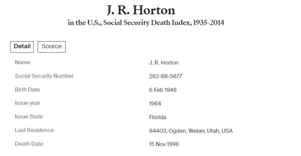 John Roger Horton was born on February 6, 1948 in Milan, Rock Island, Illinois, USA. He died on November 15, 1996, at age 48, in Ogden, Weber, Utah, USA. He was buried in Aultorest Memorial Park, Ogden, Utah.