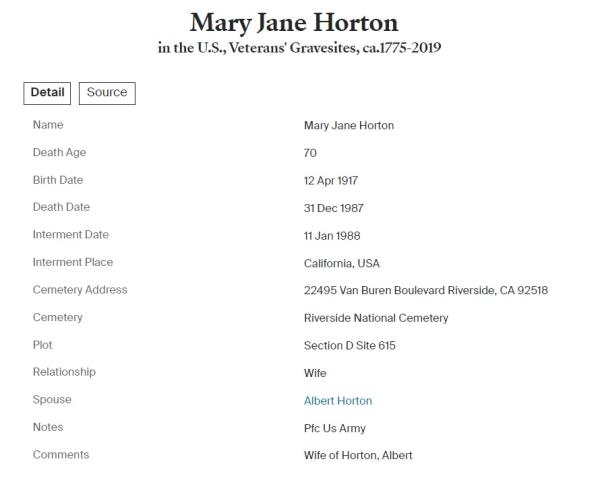 Albert Horton were married in 1942. She died on December 31, 1987, at age 70, in Riverside, Riverside, California, USA. She was buried in Riverside National Cemetery, Riverside, California.