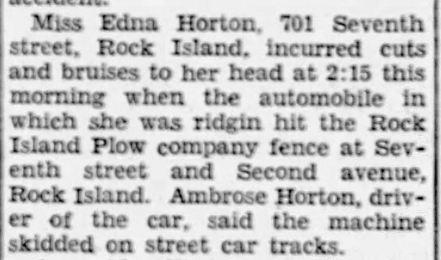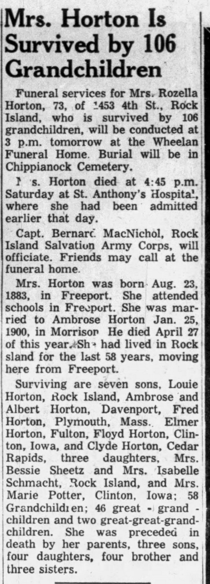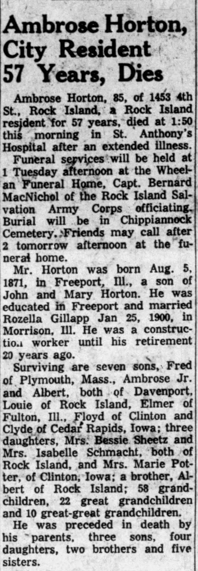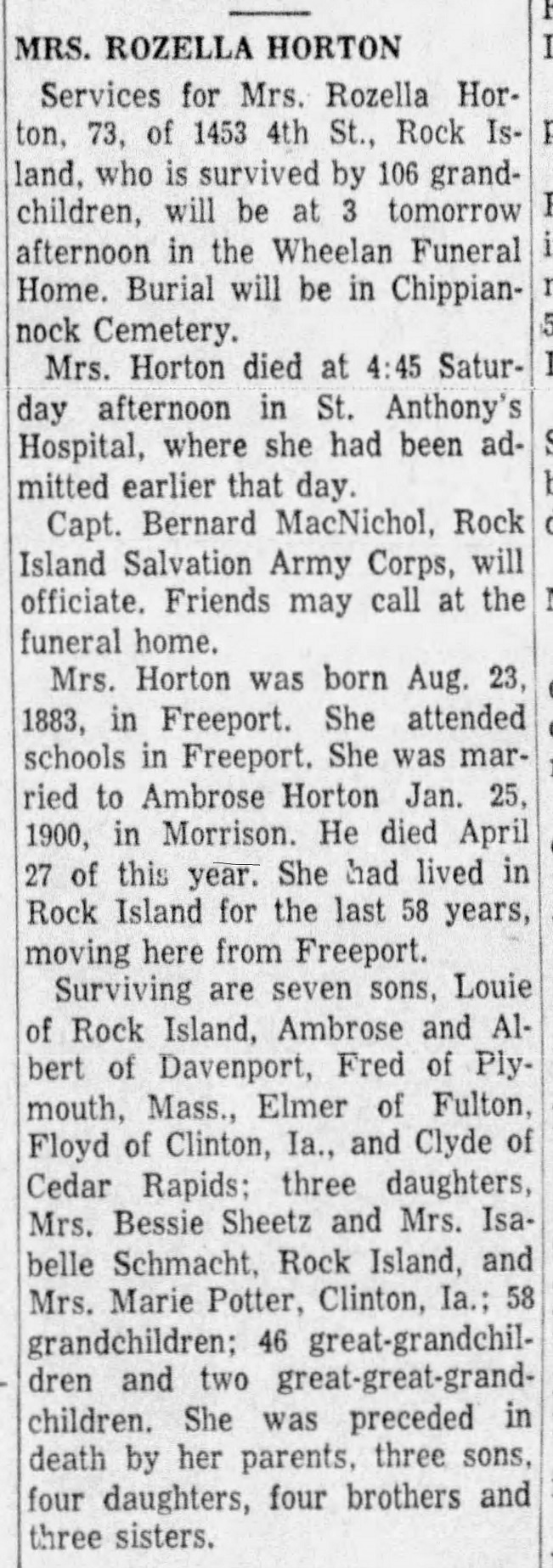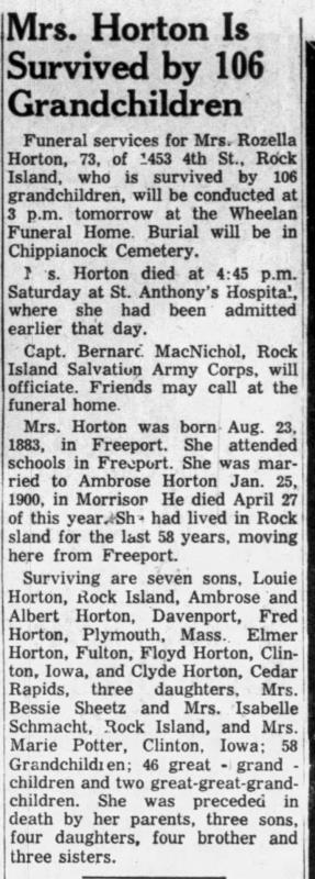 Ambrose Horton, Sr., were married on January 25, 1900 in Morrison, Whiteside, Illinois, USA. She died on May 11, 1957, at age 73, in Rock Island, Rock Island, Illinois, USA. She was buried in Chippiannock Cemetery, Rock Island, Illinois.
